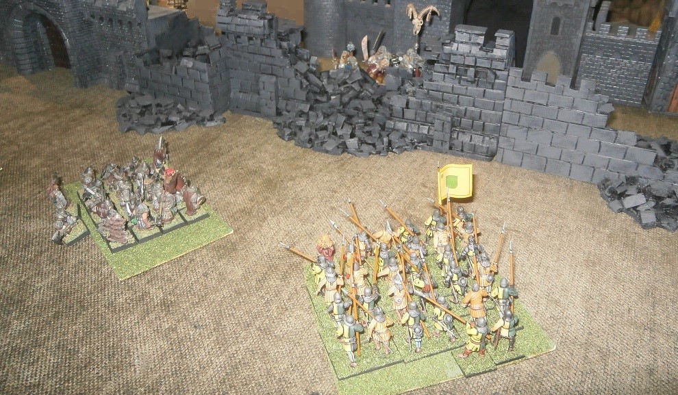 The fight was quick and nasty. Lodar somehow avoided facing the bulls’ champion, and instead cut deep into the flesh of two other bulls while the spearmen’s sergeant dodged the champion’s powerful blows. Despite her injury, Perrette spun with an elegance learned from a dancing master in her youth to avoid another huge club. Had it hit, it would have crushed her entire body to a pulp. Six spearmen died, half of them perishing from the mere impact of the hulking foes, while only two ogres were slain. The Brabanzon had the weight of numbers, however, and pressed on aggressively, presenting a wall of sharp, jabbing spear tips before them. When the remaining two bulls realised their mistake, they foolishly attempted to return to the defences. There efforts were in vane, however, and the Brabanzon stepped over their corpses to come right up to the rubble.