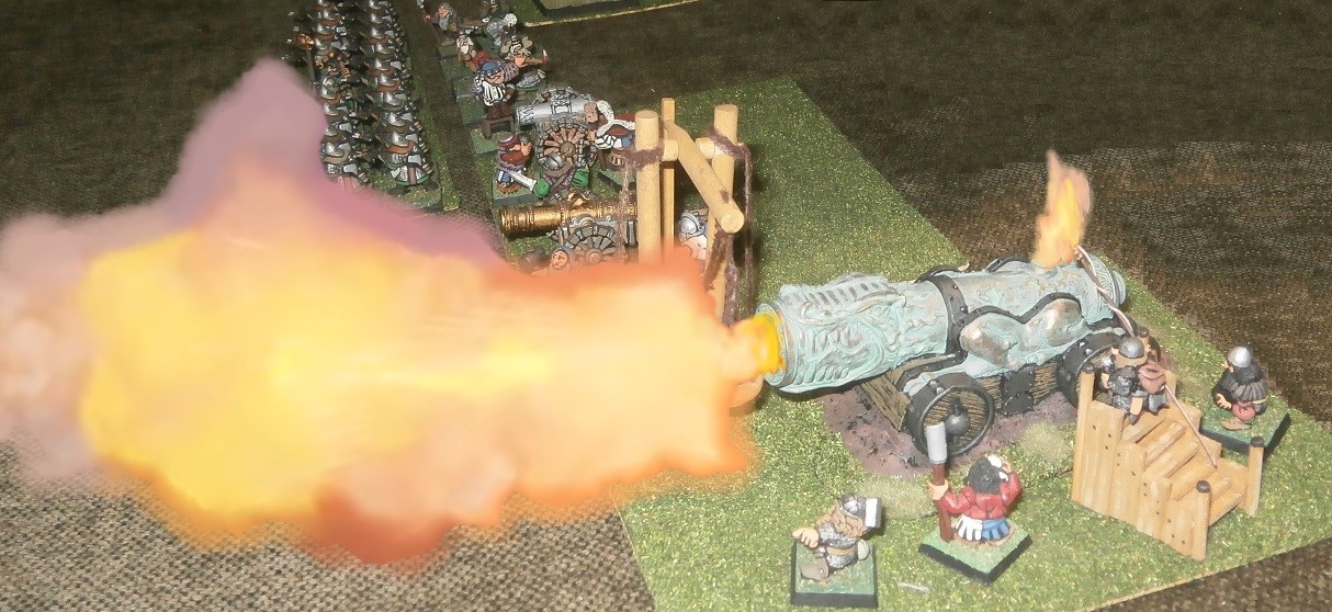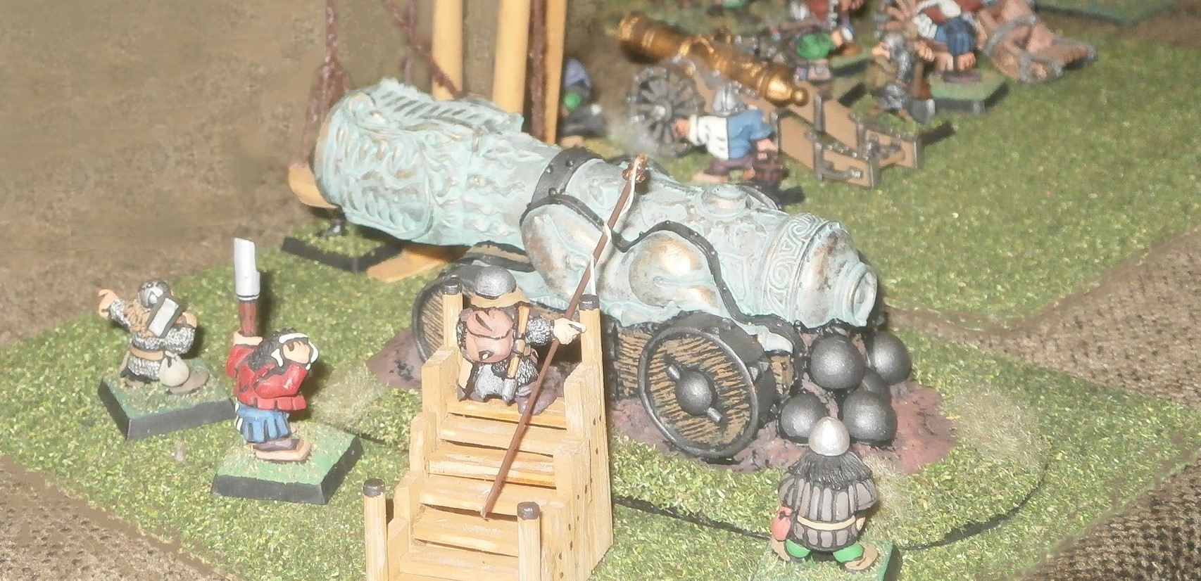 (Game Note: The siege cannon rules were lifted from our standard Tilean campaign army list, being itself a version of the Warhammer Empire Forum ‘Treachery and Greed’ campaign Mercenary Companies army list with added elements from the later ‘Empire of Wolves’ list. Neither myself nor my players had written these lists, although I had added some extra elements, like Morrite Priests and such like, to adapt it to our game world. The siege cannon is listed as 160 pts, 72” range 2D6 Str 10 wounds, 5 crew which cannot be moved – other than turned 90 degrees or less – after initial placement. It all seemed neatly to fit the model I had obtained and painted for the dwarfs.)