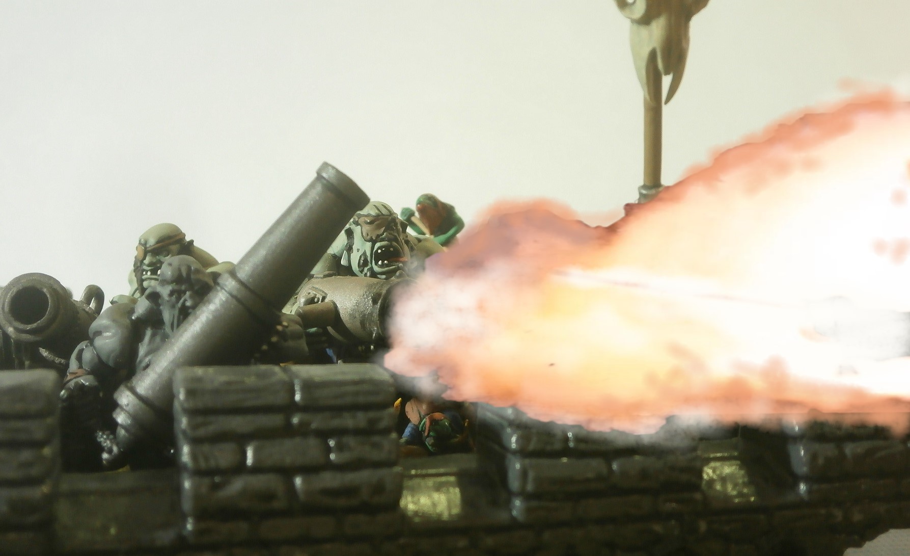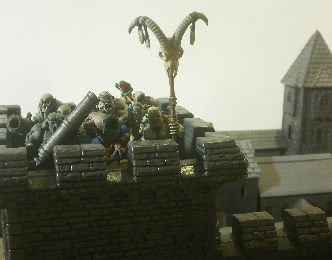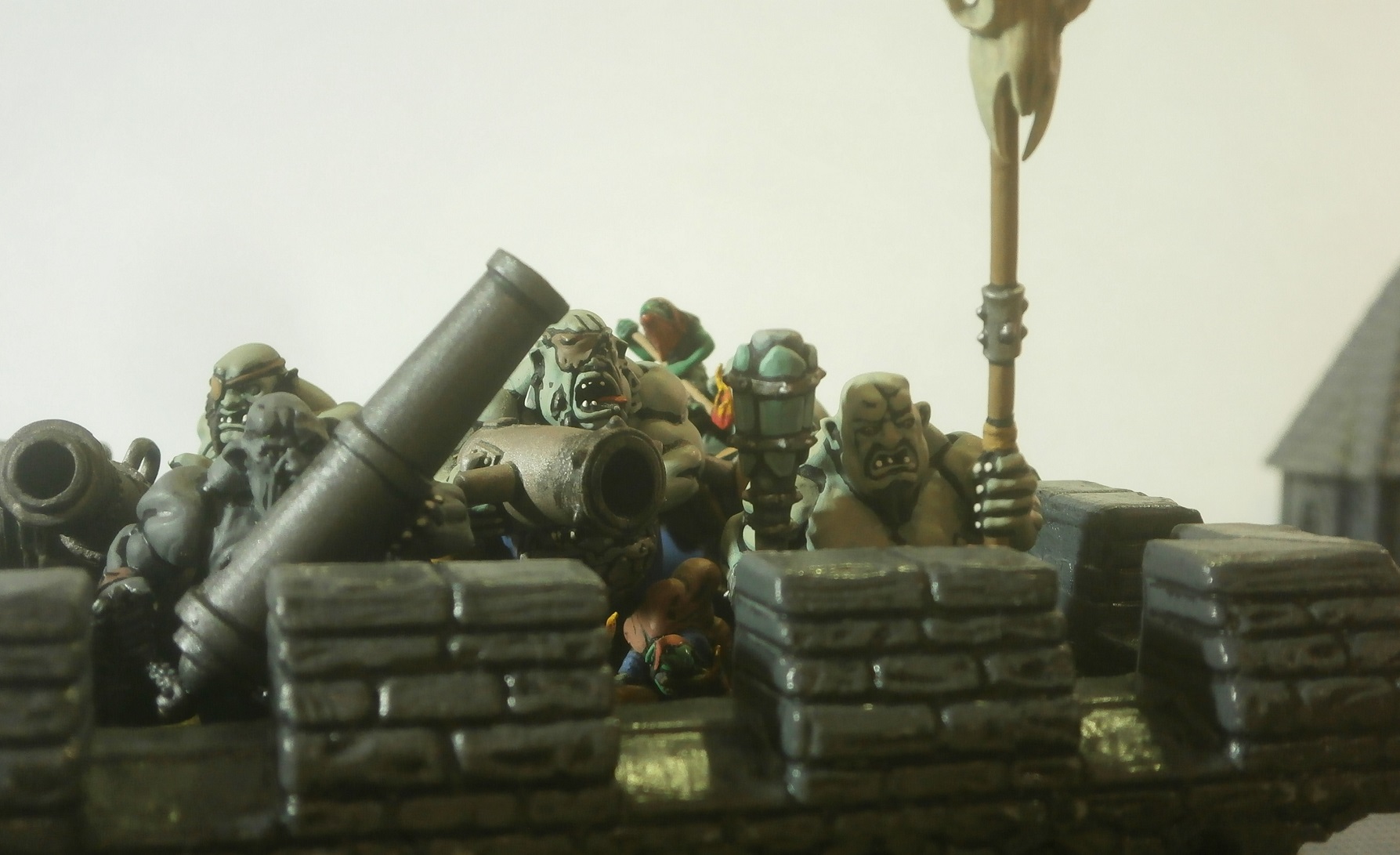 Considering the fact that Razger Boulderguts had marched a mighty army out upon his grand raid, the garrison soldiers on the walls were surprisingly numerous, with a great many leadbelchers amongst them. The southern-most tower was packed with the cannon wielding brutes, as was the next tower to the north, while the wall in between them was guarded by a small body of Ironguts.