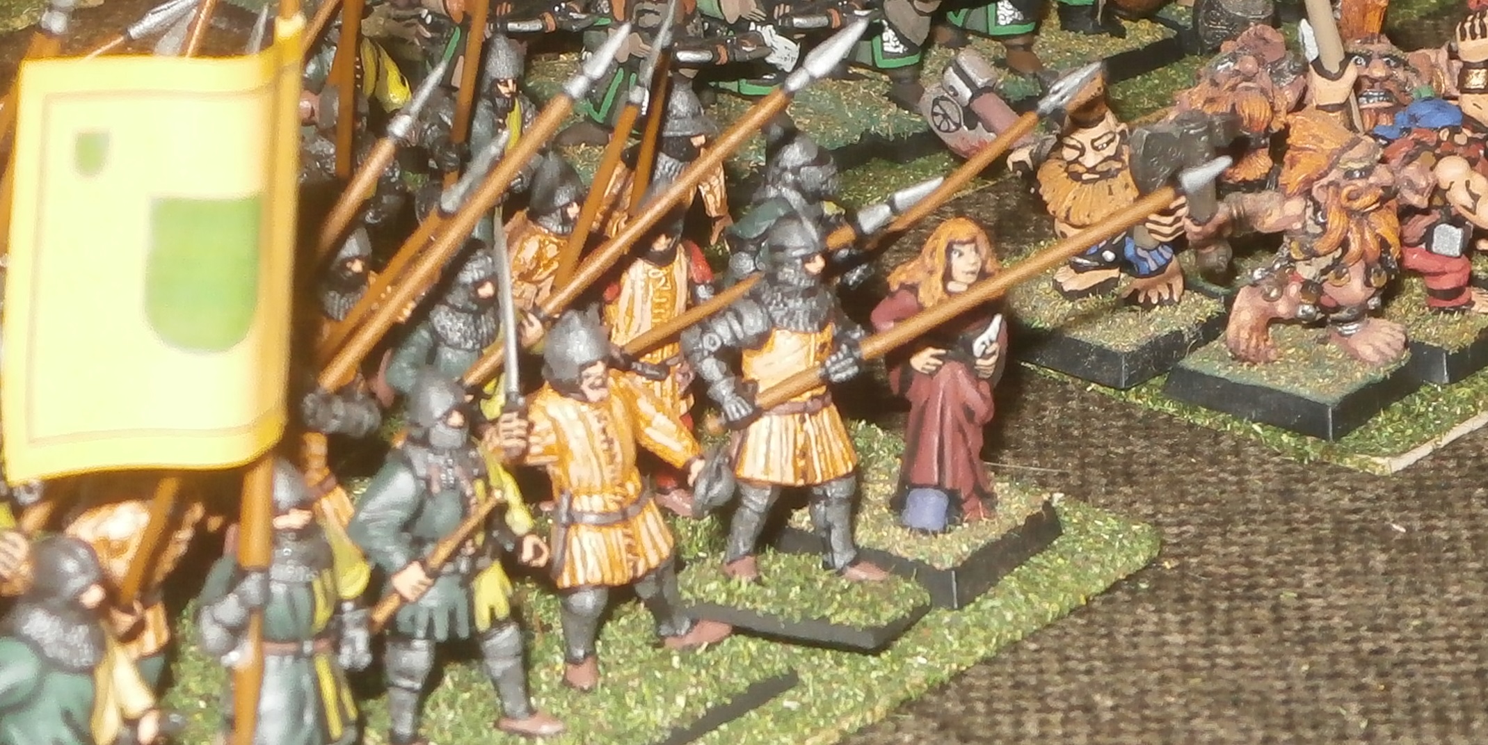 Watching from his high vantage point, Lord Wurgrut saw the dwarfen thunderers were preparing to fire a salvo at the walls, and so summoned an ice shard blizzard to assail them. His second-in-command, following Wurgrut’s lead, also attempted to inflict them with a curse called braingobbler, but he failed to contort the winds of magic sufficiently to bring the magic into being. Meanwhile, having spied the damsel Perrette, her red dress and hair marking her out very clearly amongst the dirty yellow and green liveried Brabanzon spearmen …