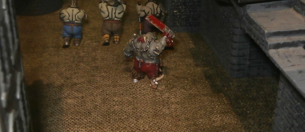 (Game Note: Embarrassingly the ogre player, Jamie, had failed to take account of the wall to the side, and until now had not thought it was accessible to attack!)