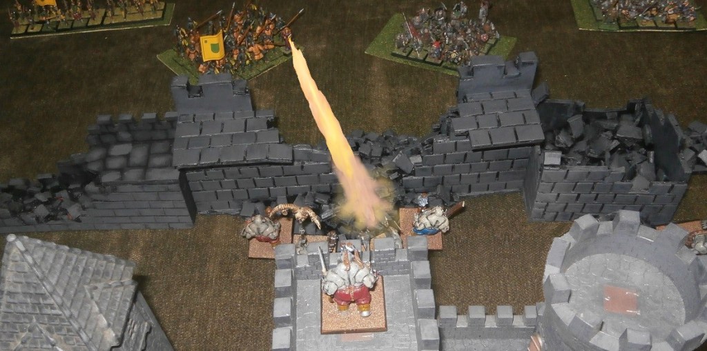 The collapsing masonry poured out fore and aft of the wall, burying two of the bulls behind. There was no time to dig them out, so if they weren’t already dead, they soon would be. (Game Note: The reason the player had moved the ogres off the wall as it had showed signs of becoming weakened was that according to the modified 6th Ed WFB siege rules higher strength wounds are inflcited upon a unit on a collapsing wall than by a unit standing next to the collapse. Nevertheless, we did not expect 2 ogres to perish from the 2D6 str 3 hits they now received.)