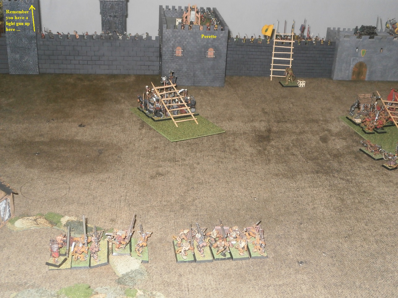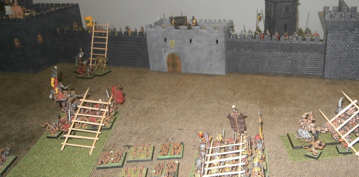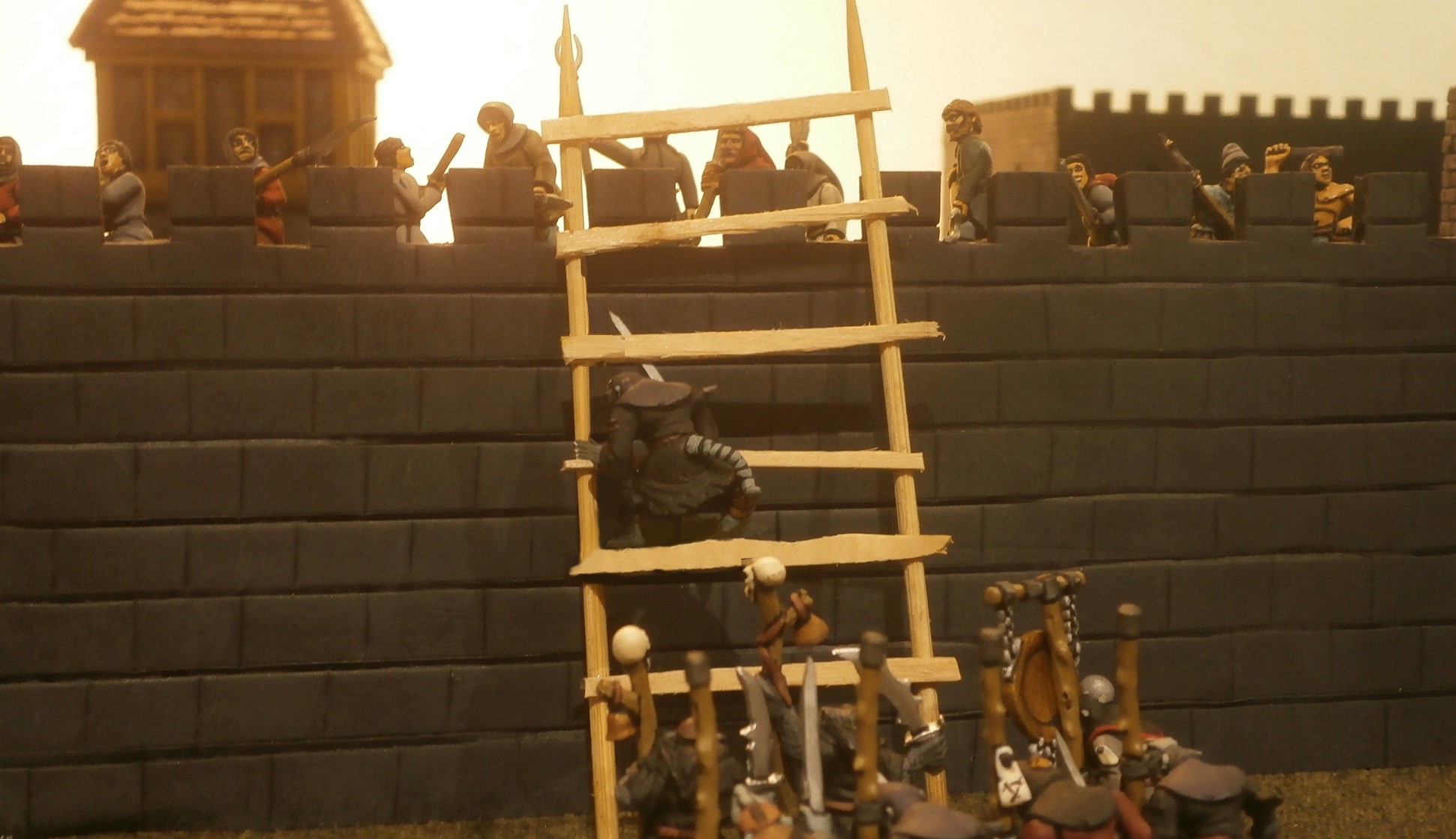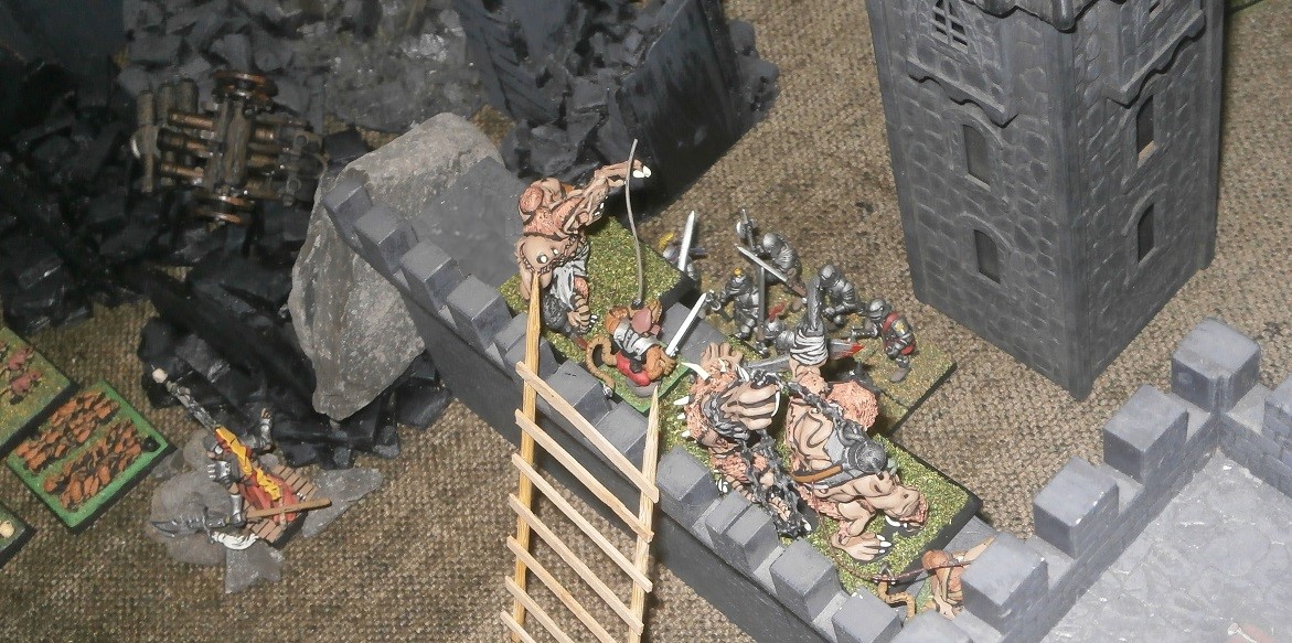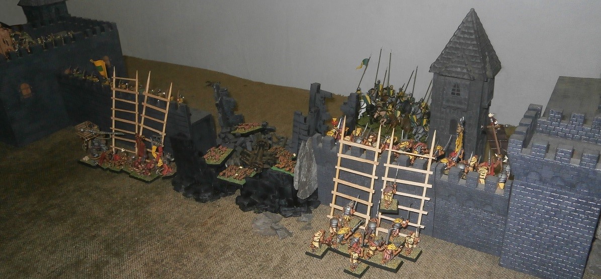 We have our own rules for assaults by ladders (not easy at all) or siege towers, although once on the defences, the fighting between sections is basically the standard fighting in buildings rules from the 8th ed’ rulebook.
