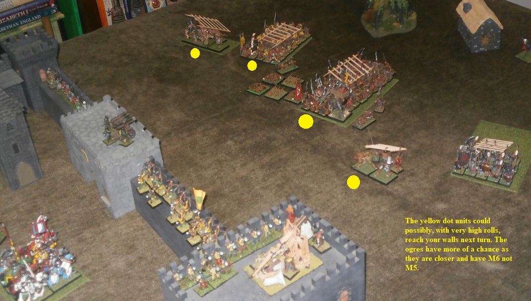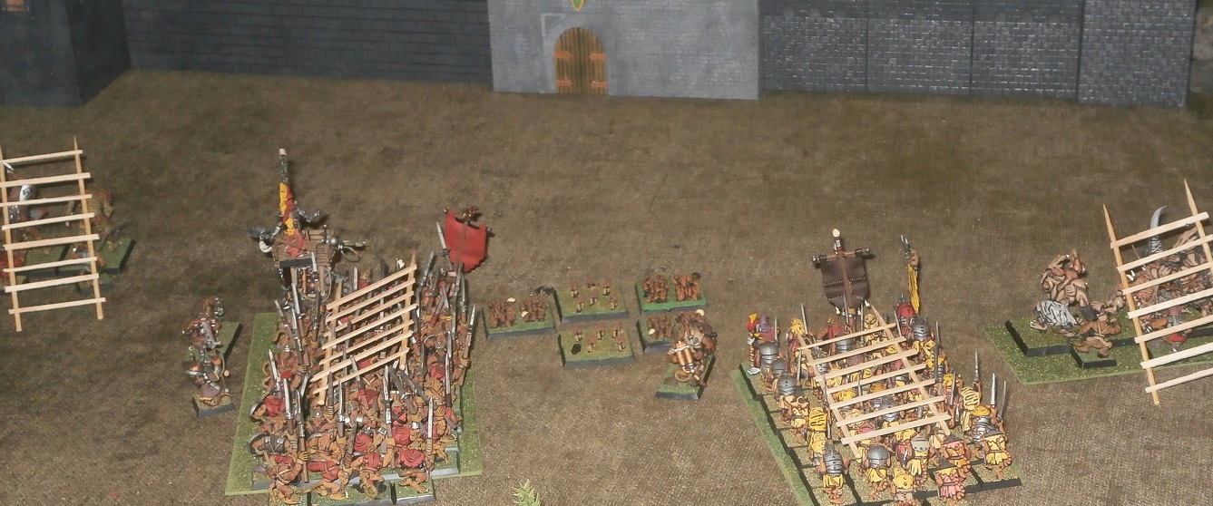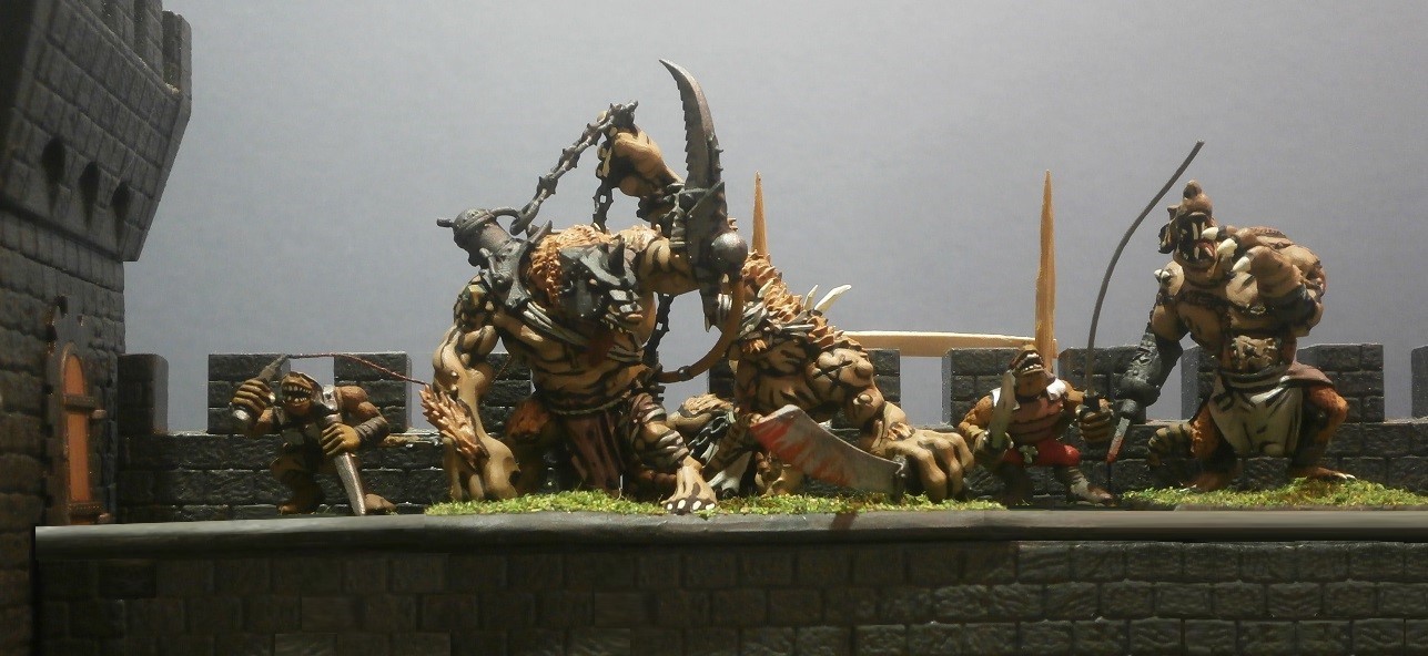 … now ascended the ladders as best they could. Of course, the longbowmen had the advantage, killing the packmasters driving the brutes in a hail of arrows before they even set foot on a ladder, and wounding an ogre before it reached the top of the wall. Four longbowmen were cut down or thrown off the wall, while one of the ogres was finished off by the archers’ swords. As that ogre fell, the surviving one struggled to hold on and slid back down the ladder. Winded, it staggered back, and although its previous fury had been beaten out of it, it’s only intent was to climb the ladder again, come what may!