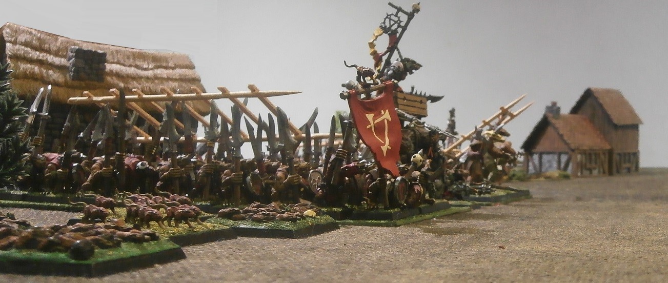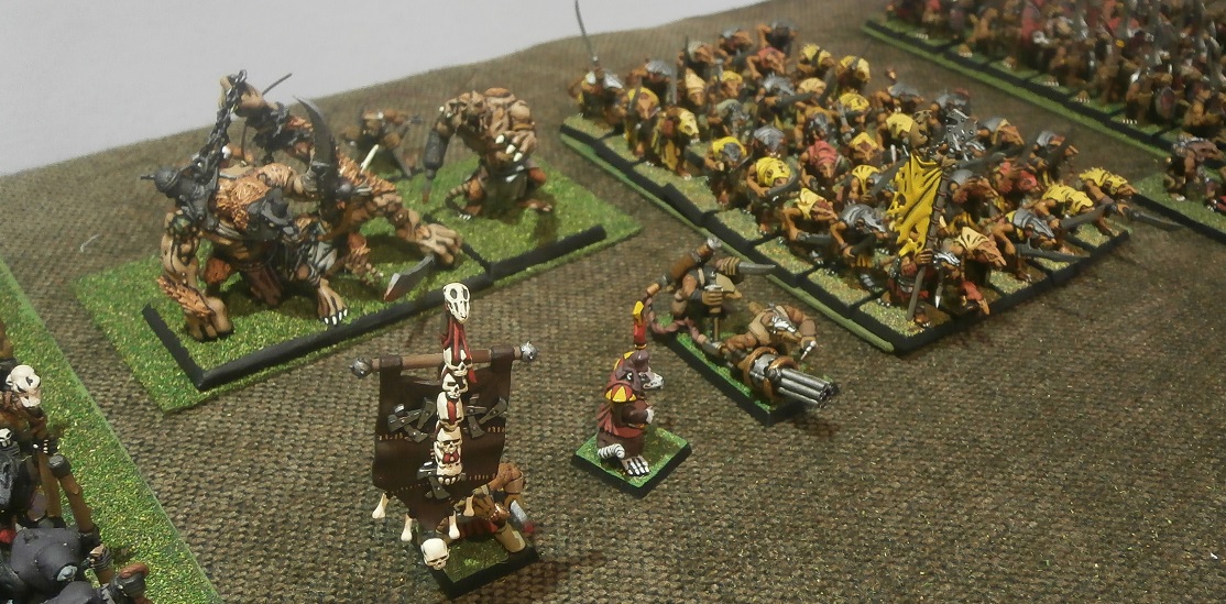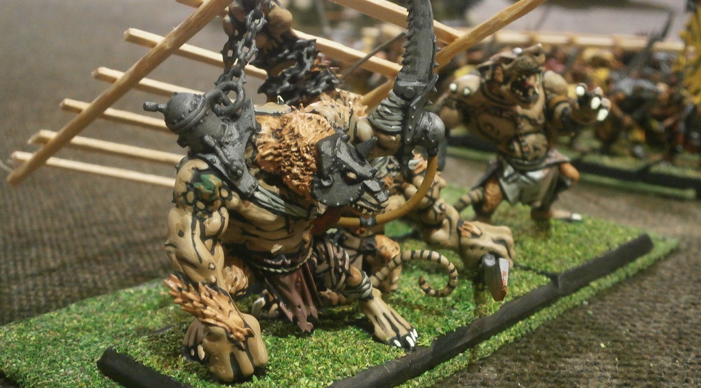 There are three other rat ogres in his clan’s little army. The clan’s main unit is the ‘red regiment’ (they have a red banner), being 50 clanrats strong, plus a ratling gun.