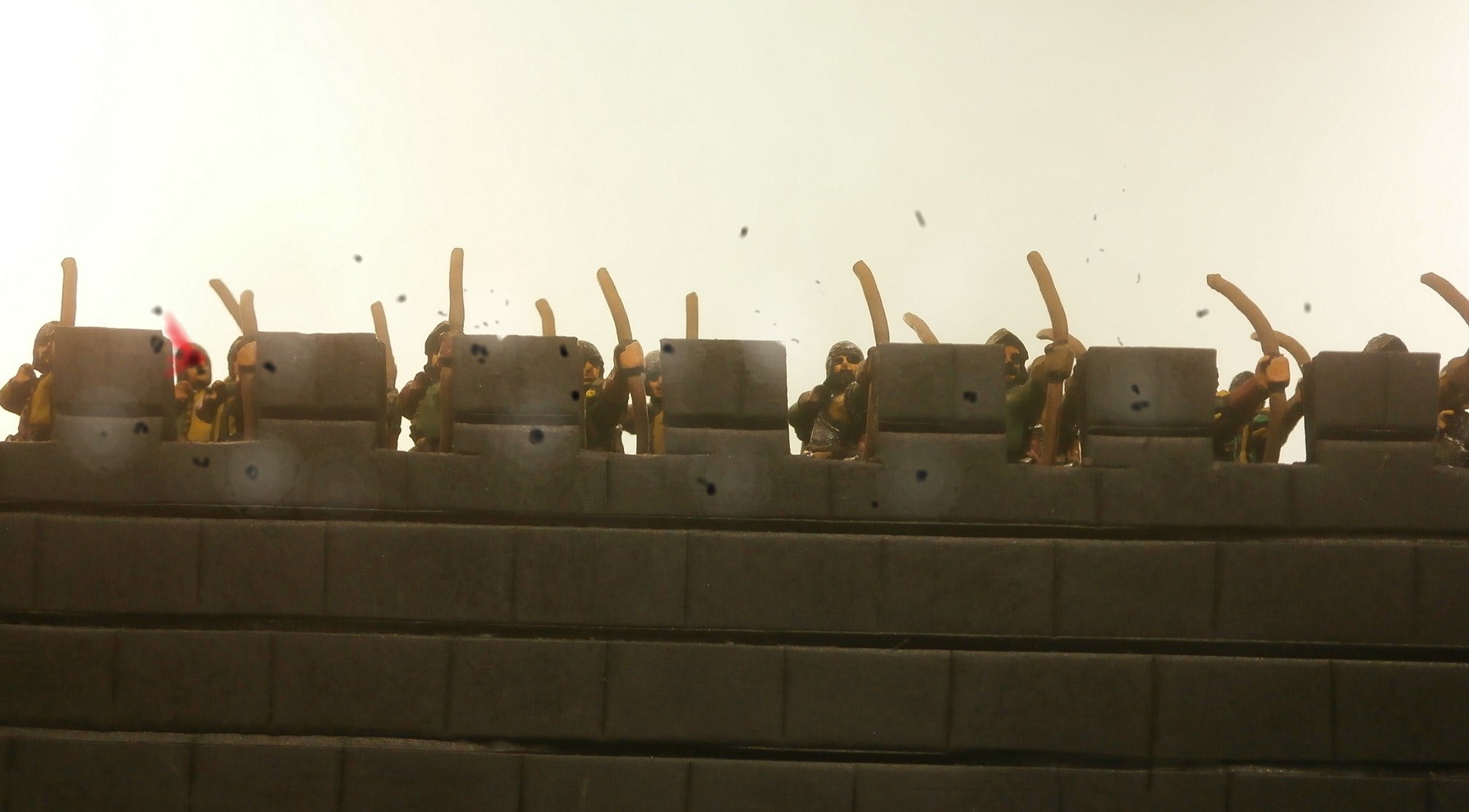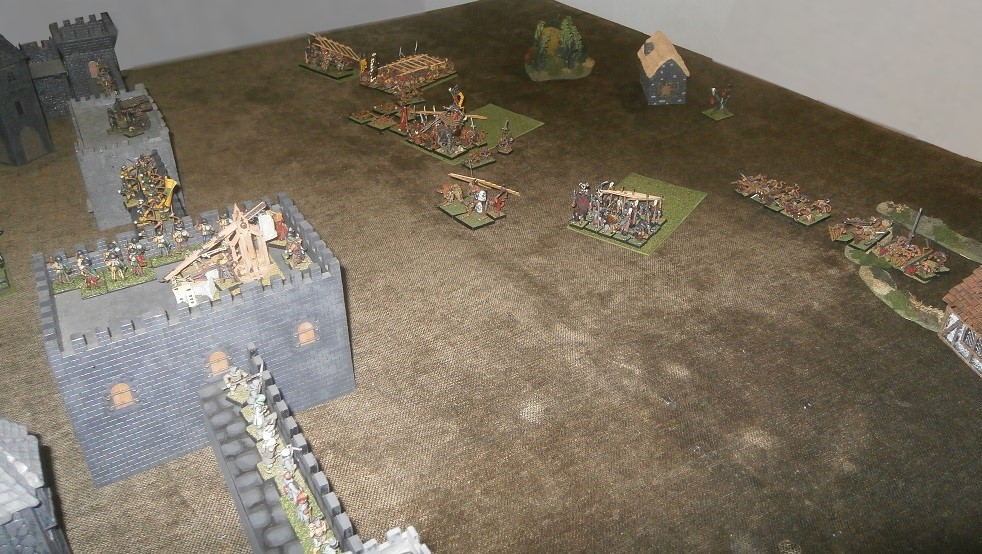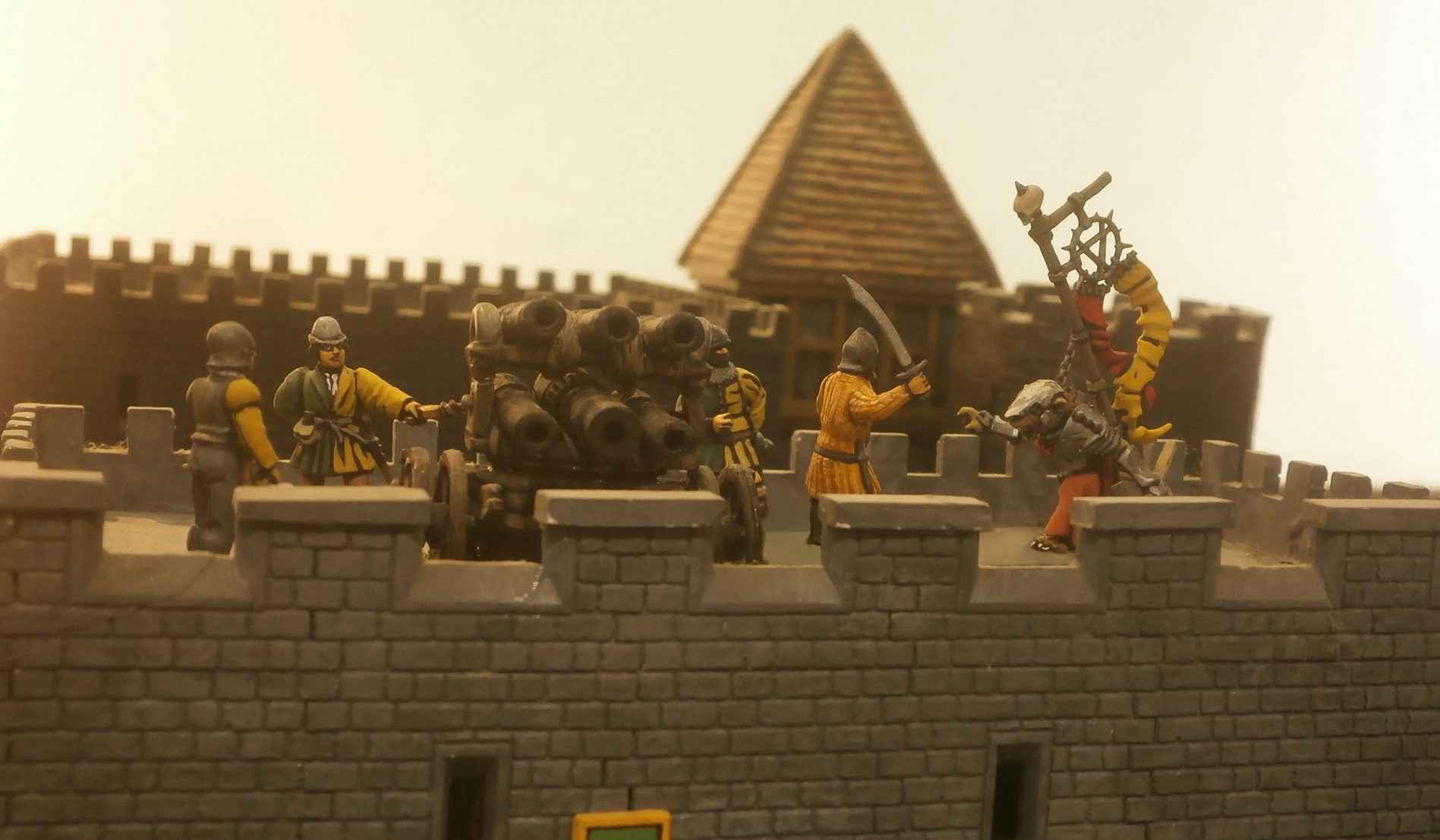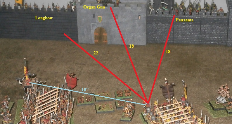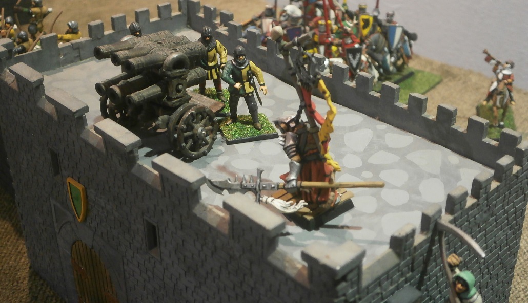It was now the longbowmen’s turn to experience the explosive peppering of their battlement – two died to the ratling gun’s bullets and another to the jezzails’ shots. As the dust cleared, they set about knocking arrows to their bows.