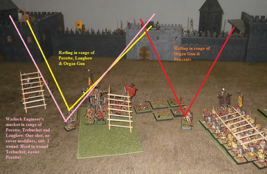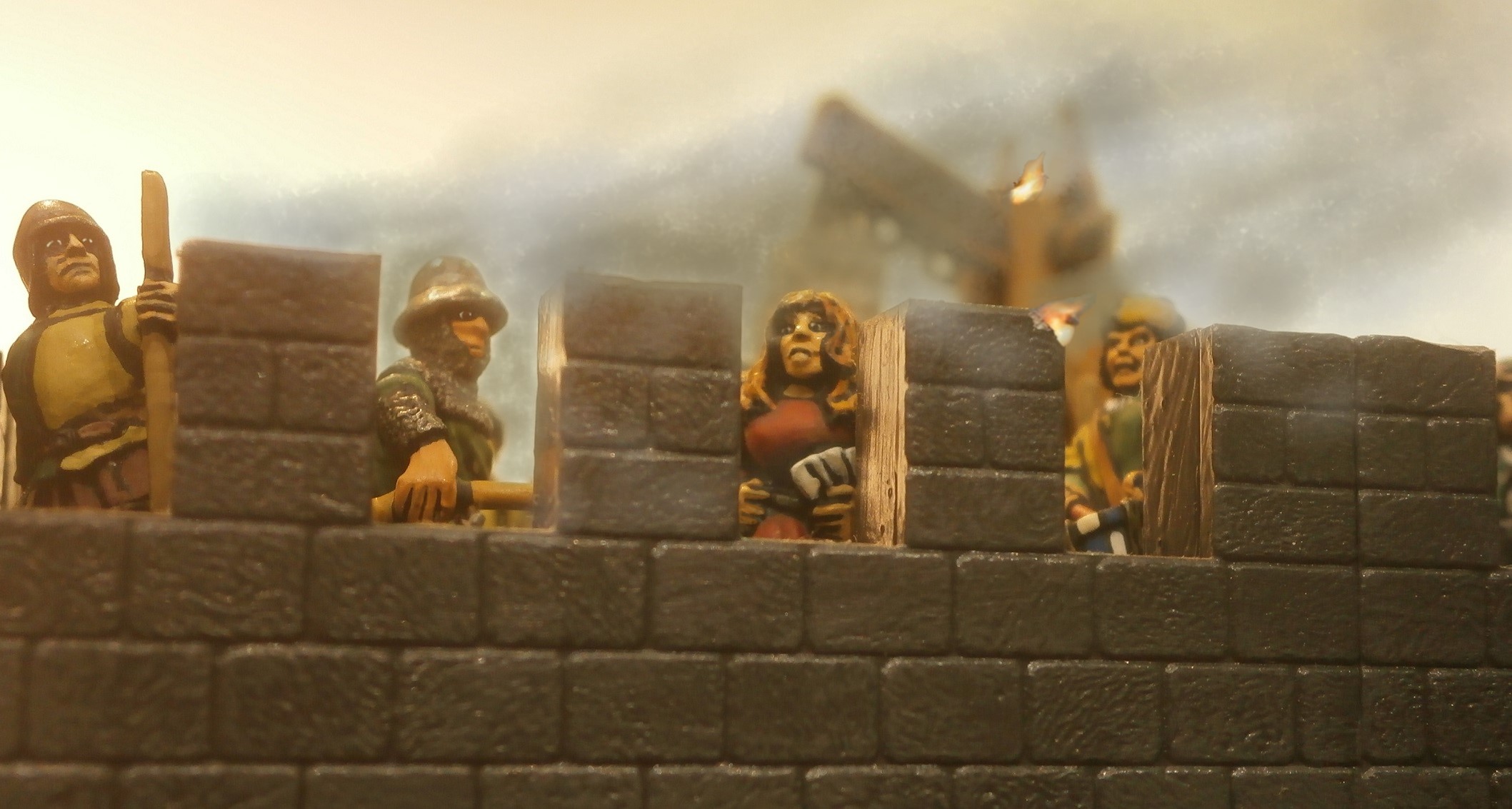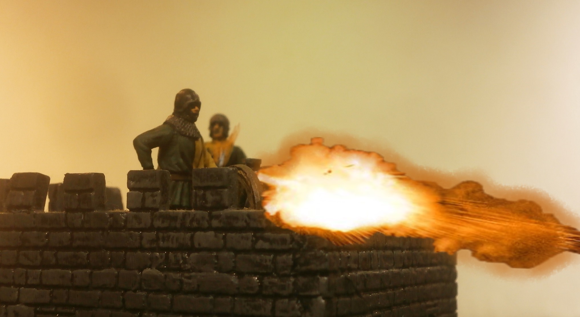 Not one bullet, however, found its mark, something the shooters did not know for some time, what with the obscuring cloud of dust and smoke now engulfing the tower top. The other ratling team, hearing that the first had now opened up, chose an easier target – the peasants on the wall in front of them. It was the last choice they ever made, however, as their weapon broke apart in the firing, mortally wounding them instead of the foe.