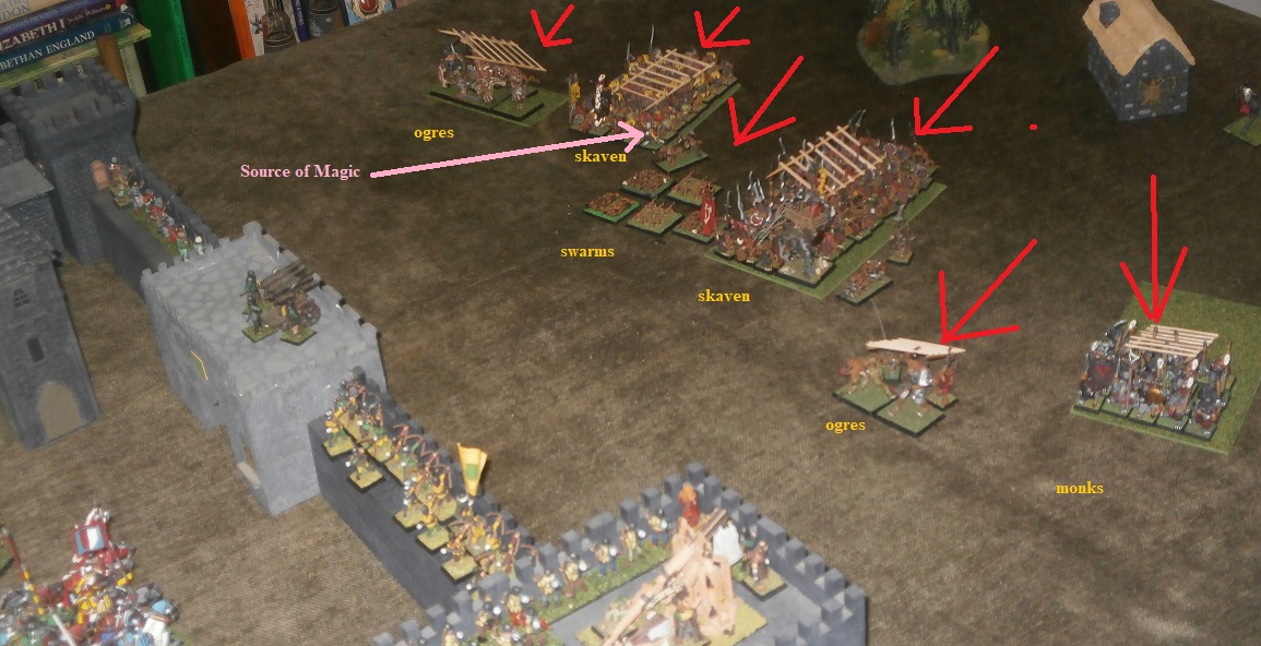 (Game Note: Apparently twelve WS2, Init 2, Ld6 peasants CAN hold a wall against 16 frenzied plague monks! The siege rules say that in a draw the wall is not taken and the attackers are positioned 1” away from it to attack again in their next turn, but as it was a draw, however, the plague monks did not lose their frenzy. Unless the monks died in the intervening Brabanzon phase, we would see if the peasants could repeat the trick later?)