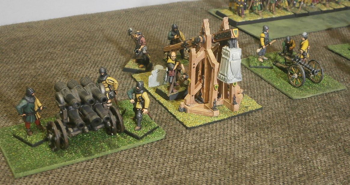 The two engines featuring in the prequel story are seen here – an old Citadel Miniatures’ trebuchet and crew and a kit-bashed monstrosity I cobbled together years ago in lieu of a Helblaster. The latter just so happened to look like exactly what would result if a dwarfen engineer fixed six leadbelcher barrels together. That, and the fact that the ogres had indeed only been allowed to march away if they laid down their arms, as well as that the dwarfs sent to assist Garoy and the Brabanzon had been commanded by an engineer (they though, after all, they would be besieging the city) meant I just had to use it. I crafted rules for it almost identical to ogre leadbelcher rules, but with the chance to misfire and a suitable table to roll on.