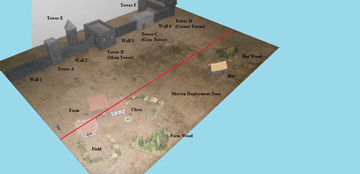 Our campaign has rules for fighting an assault such as this, based on the old Warhammer rules, some going back as far as sixth edition or earlier. These have been modified throughout the campaign as we incorporate new ideas that come up during play, and deal with problems and the like. Basically, it is a 7 turn game (sometimes 8 when the GM thinks it appropriate, and a die roll allows) in which the victor must try to control the greatest number of the defences’ ‘sections’ by the end of the game. Each tower and stretch of the wall is a section (see the picture above), and there are two further sections inside – left and right. To control a section you need an unengaged and non-fleeing unit (or character) in a section, and no non-fleeing enemy models. By the way, the two inner towers (E and F) on the picture above were not official sections, although they were in the internal sections. In this game there were 11 sections to play for, which included the side wall not labelled above. (That wall could only be reached from inside the city, due to the steep stone footings beneath its outside!)