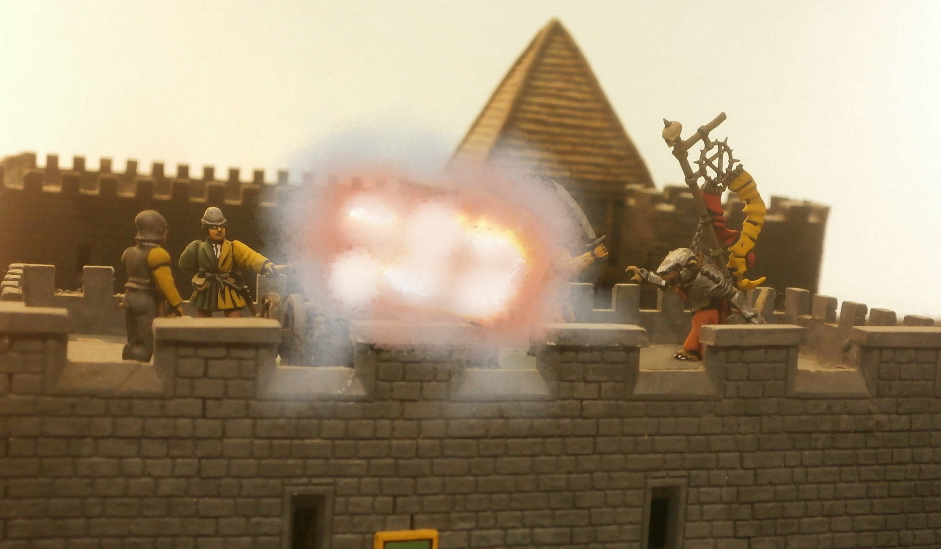… but its stinging caress distracted them, for this time their engine’s hurled rocks landed far wide of the intended mark, damaging only the ground! Meanwhile, the brave gunners on the neighbouring tower, despite the warlord’s presence close by, fired their piece.