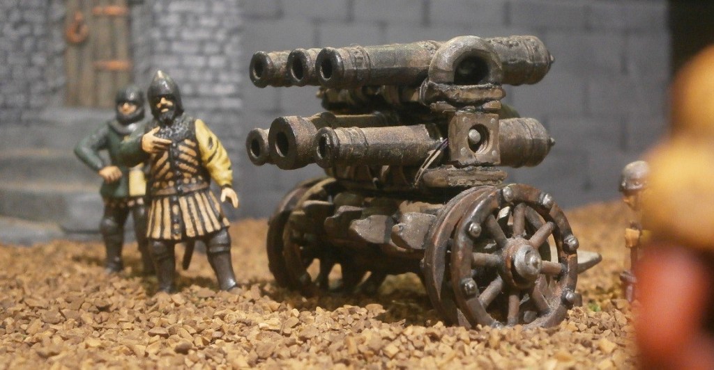 “I’m impressed,” said Perette as she walked over to the engine to inspect it more closely. She had seen such barrels used in anger – indeed she had tasted the fear they could induce. The ogres at Campogrotta had had lots of them. So many, in fact, that the first assault (Note *1) had failed because of them. She herself had witnessed a multitude of their gaping, black muzzles during the first, tentative foray over the rubble.