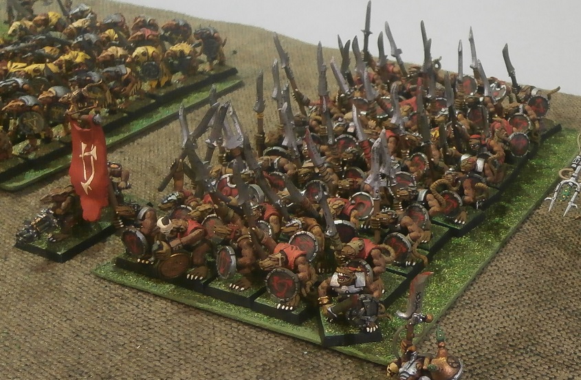 Before he gave the order to advance, he glanced about him, to see if his army was in order. To his left he saw Clan Skravell’s red regiment, with Gurthrak atop his Bonebreaker at the fore. Just beyond he could make out Skravell’s ogres, and the dangerous end of their ratling team’s weapon.