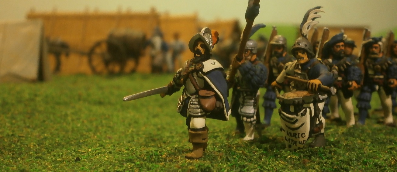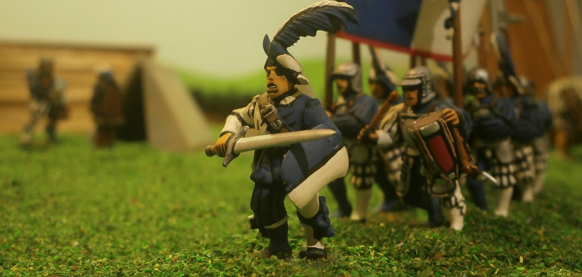 … while a swaggering youth with an oversized panache strode with bared blade ahead of another company.
