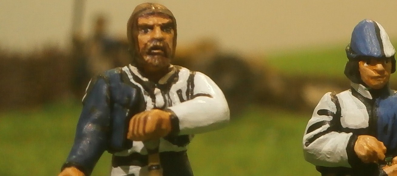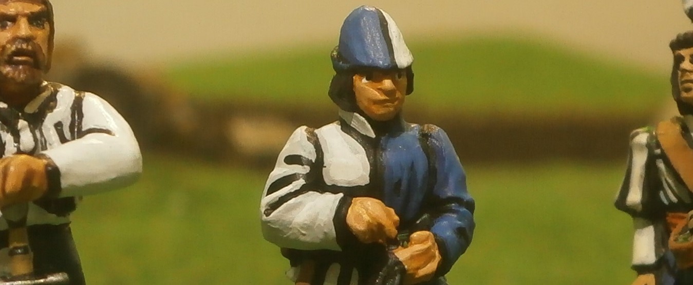 A broad-shouldered man, with a chin as wide as his cheeks, Captain Gesualdi was armed with a bow like the rest of his men but had a scarf about his head instead of a helmet. Like his entire company, he wore dark clothes – his tunic being a dull shade of purple, his scarf burgundy.