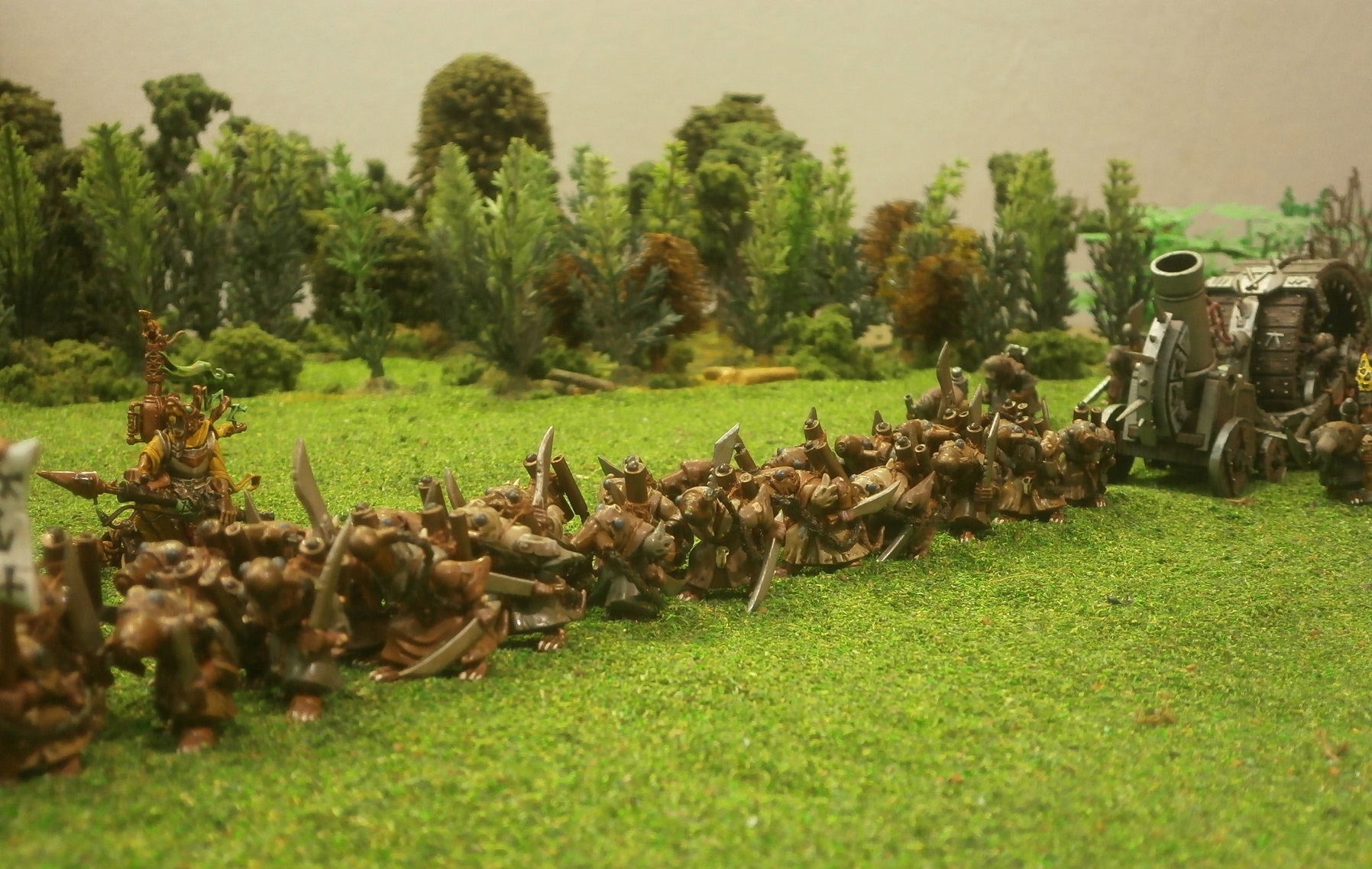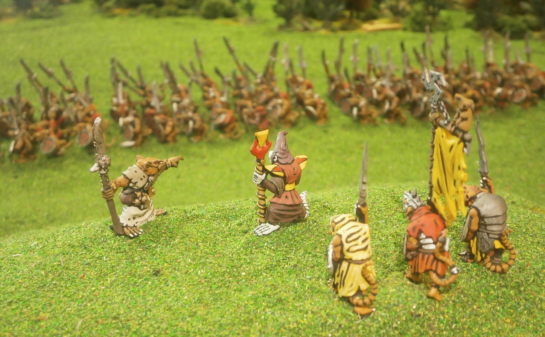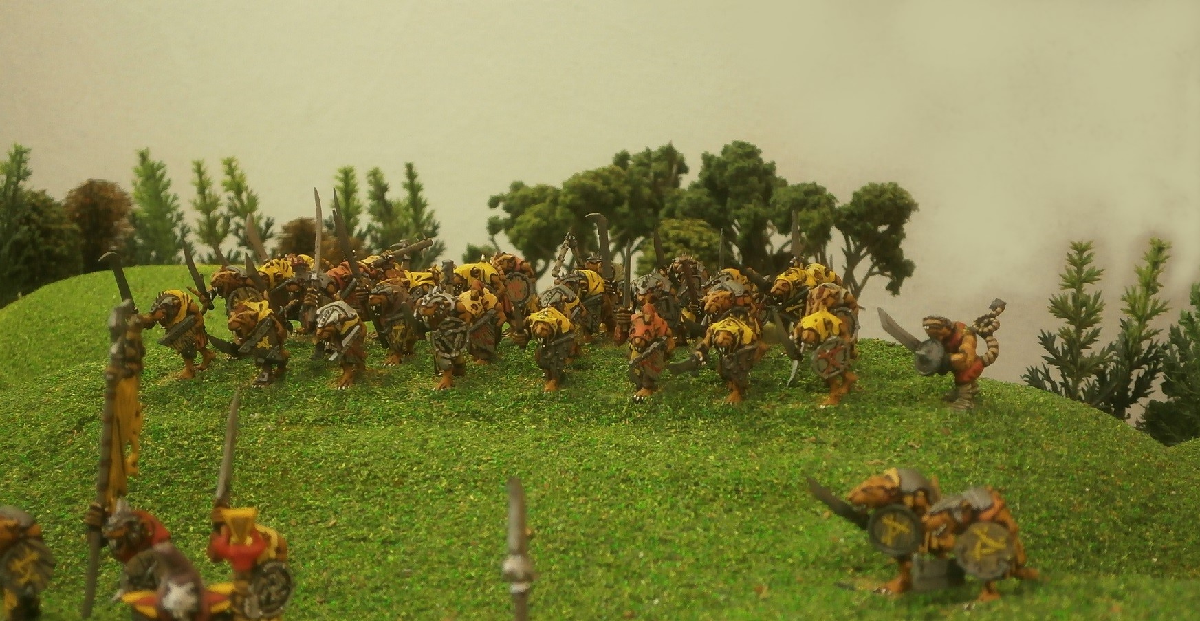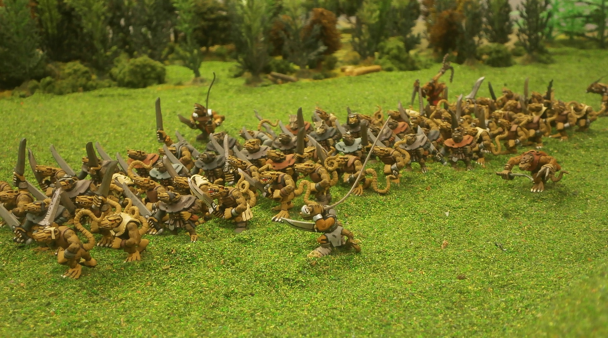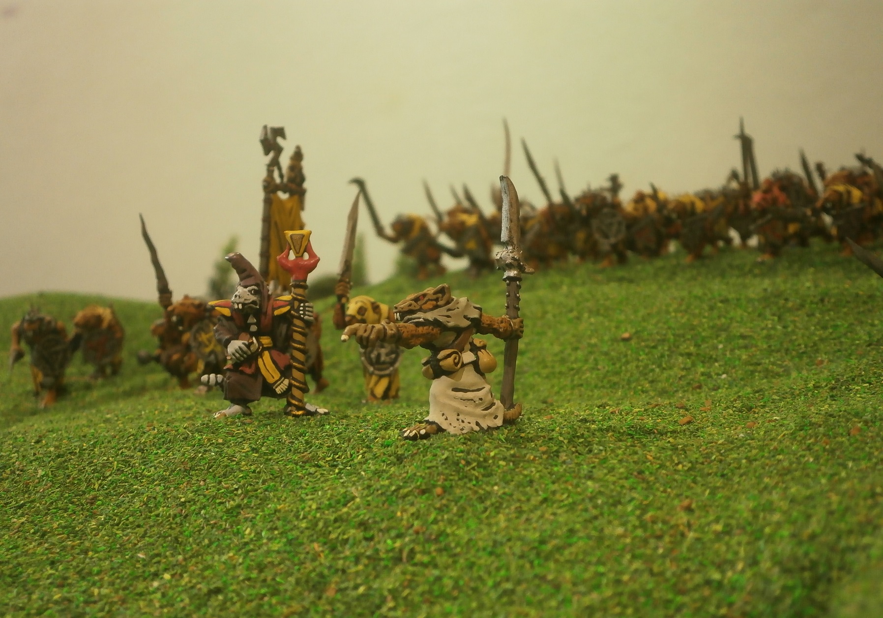 First to heave into view were the warriors of Clan Fiddlash’s ‘Red Jullgak’ Regiment. Armed with barbed spears and bearing round, iron-rimmed shields, they marched in good order, the sound of their hissing and snarling mingled with the clattering of their armour and gear, both louder than the noise their footfalls made upon the soft ground.