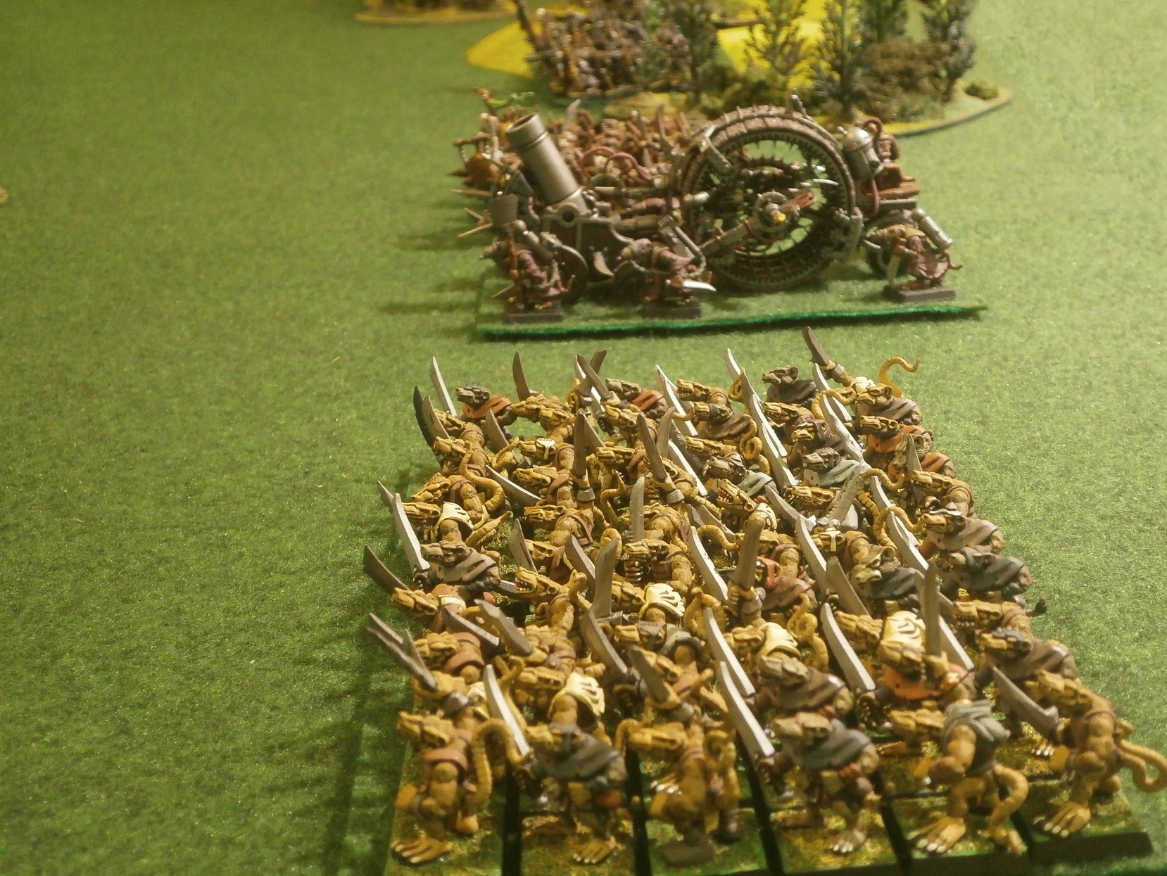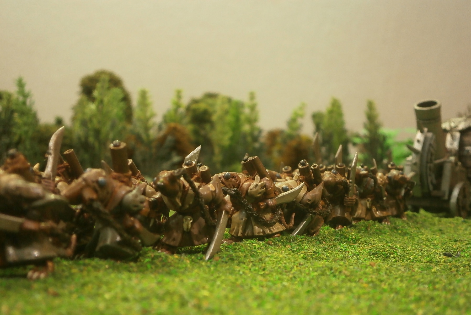Lord Urlak had sent the jezzails with exactly such a target in mind. His orders were clear – they were to kill any enemies who might threaten the annihilation bombard with missiles, and do so as quickly as possible. Of all the forces available to him, Lord Urlak must have thought them best able to do so due to the range of their long pieces and the potency of their warpstone bullets. Annoyingly, however, the two companies of jezzails had been ordered to advance separately, to cover a wider area. This first company, five in number, saw immediately that the crossbowmen were numerous enough that it could take considerable time to drive them off, time in which the enemy might shoot their own weapons at the engine.