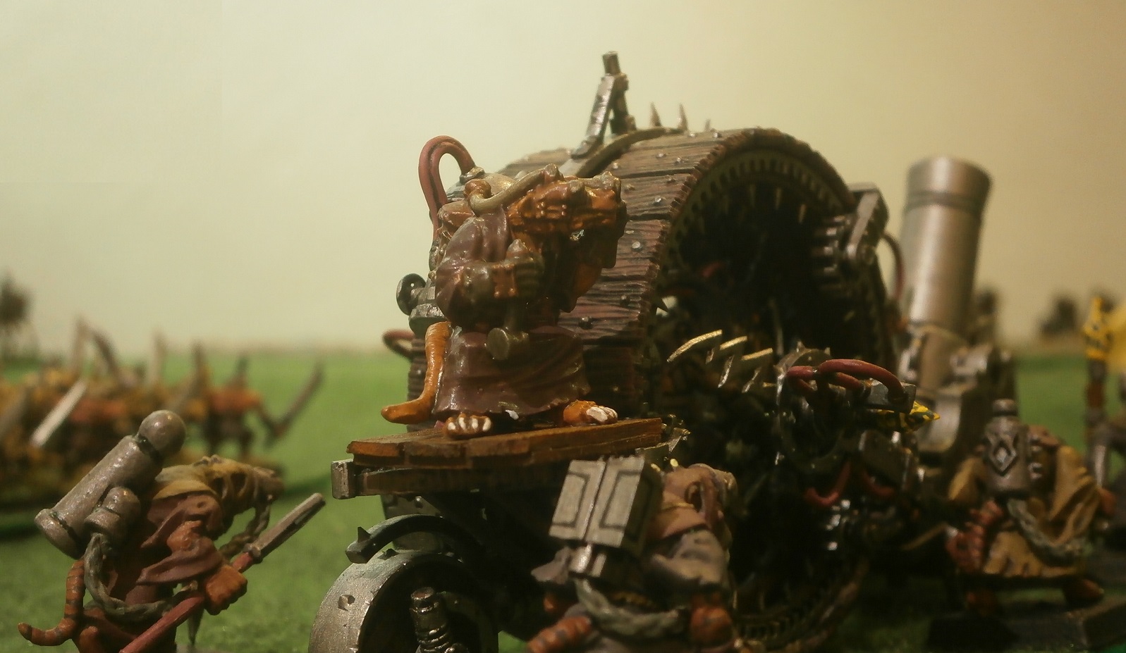 Before long the Clan Skryre warriors of the bombard’s guard regiment were below, the swish of their waxed linen and leather robes adding an extra sheen to the rattling sound of their passage. The bombard rolled behind, pushed by the mechanical wheel in which a new driver had to be placed almost every week, despite the several protective layers he wore!