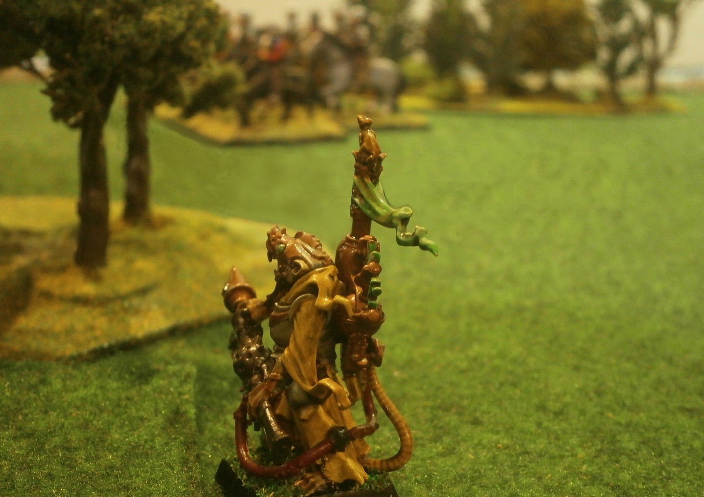 On the right of the line, although not as far out as the second jezzail company, the remnant of the once large plague monk regiment advanced between two clumps of trees, the sun behind them. Despite having been badly mauled when taking the walls at Ravola, rather than perturbing them, the experience seemed only to make them more keen for battle.
