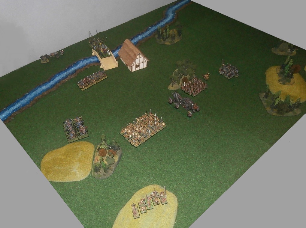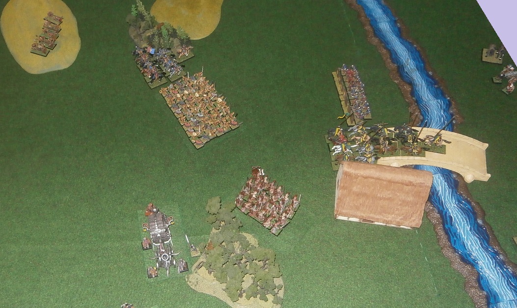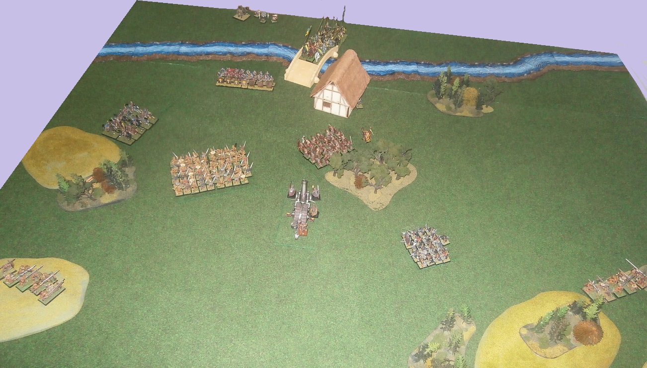 (Game note: Dangerous Terrain tests seem a bit too ‘weak’ at times. This was not a stream, but a large river which carried river traffic, deep enough to require a bridge. So, not wishing to rule the river impassable as I have in past games, and thus deny a dramatic attempt to cross, I ruled that the 41 models would take two Dangerous Terrain tests each. It is summer, when the rivers are lower than Spring, and this is quite some distance from the sea, so it wouldn’t be at its deepest. 82D were rolled, 12D came up 1. I think the halberdiers did well. The sad thing is that they were still in the river at the end of their turn, being unable to march move, and so would have to take the double tests again! I did say the marshal was desperate!)