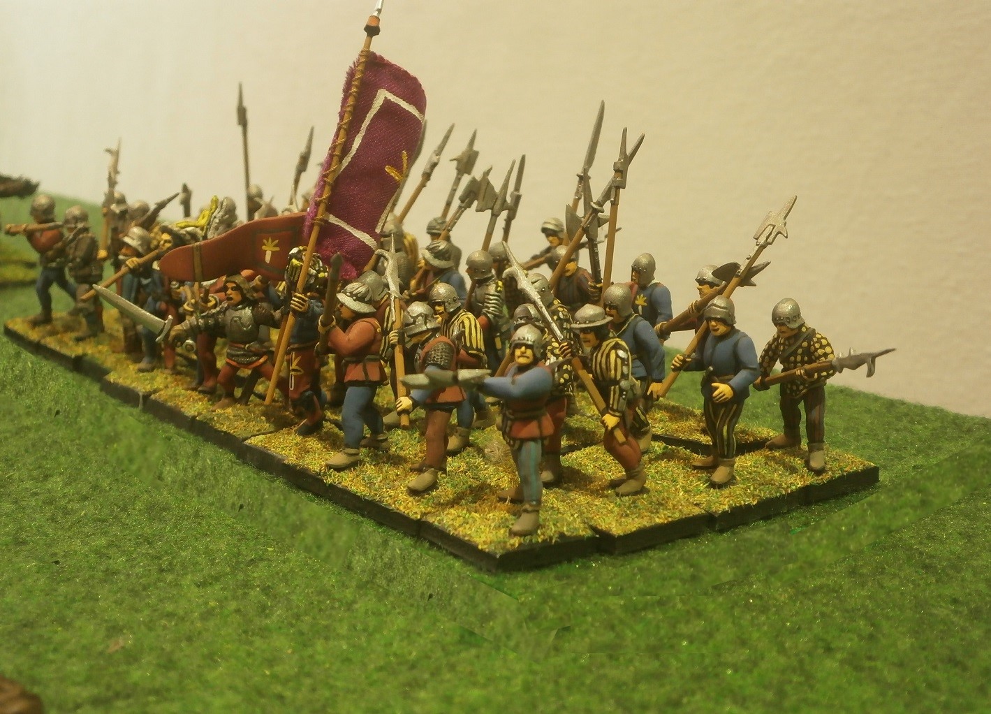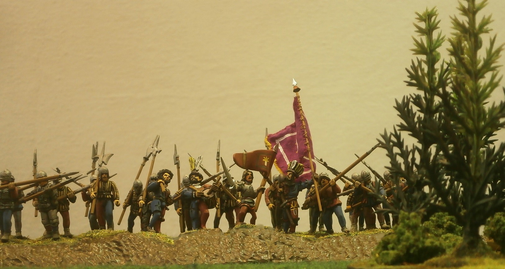 The enemy had obviously been forewarned of their approach, as they were formed up in an orderly manner, and sheltered behind their own pavaises, some of which were painted with their company’s emblem, which was also visible on the little ensign fluttering in the breeze above them.