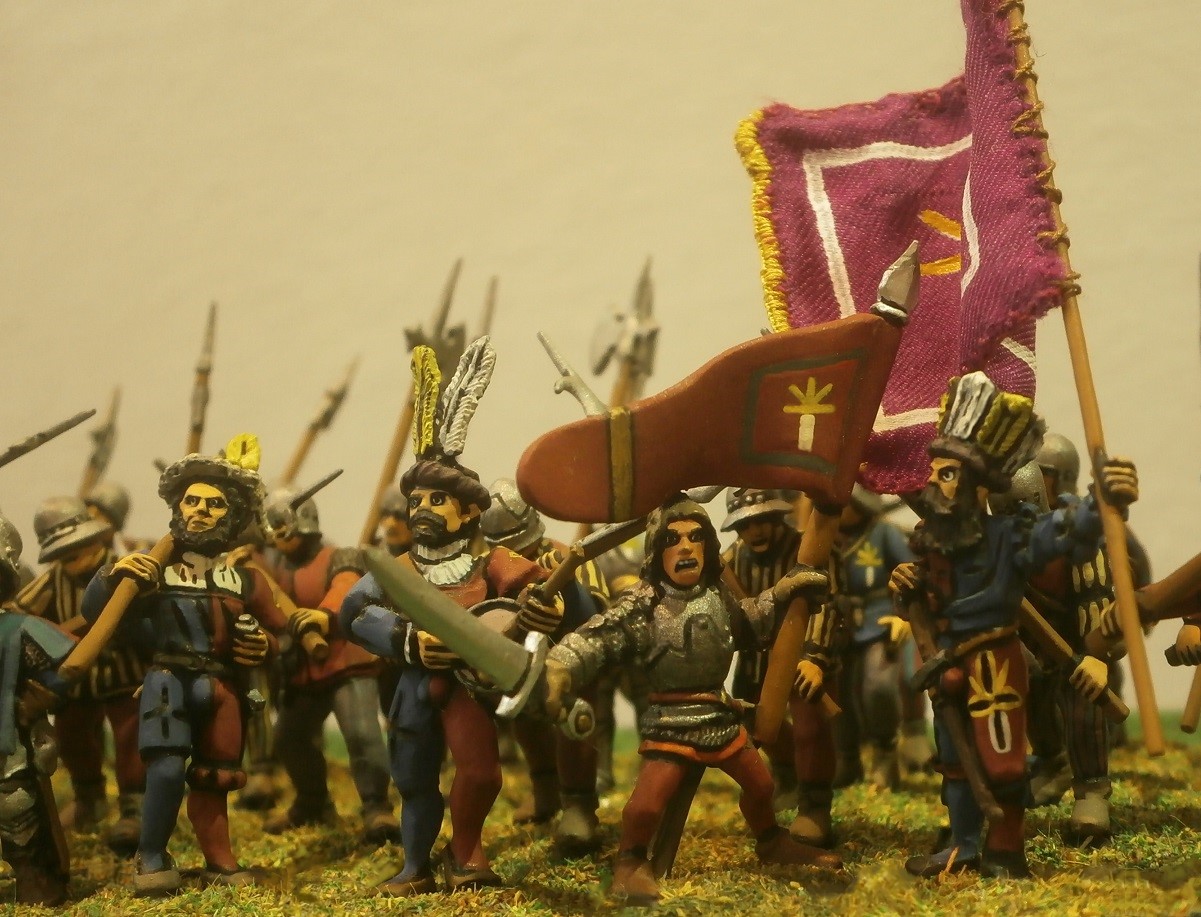 Upon the far side of the river, entering the field with a flamboyant fluttering of flags, the largest regiment of the Compagnia del Sole, the halberdiers, marched on. They bore their enchanted banner, blessed by the goddess Myrmidia. Apart from their armour, both leather and steel, they were clothed in the company’s maroon and blue, some sporting the Myrmidian white baton and yellow half-sun emblem that was also emblazoned upon their standard.