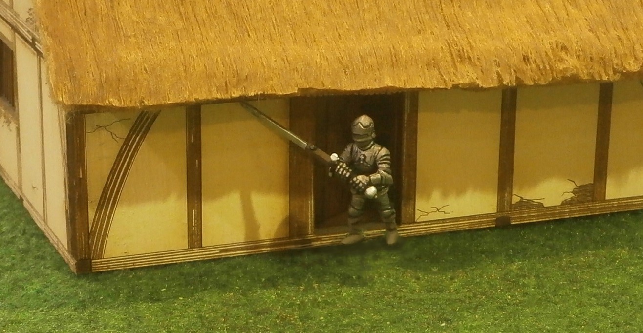 Satisfied, Golchramik took a breath, and tasted the acrid smoke still curling from the muzzle of his rocket tube. Then something caught his eye, something shiny, over by the cottage. Squinting as his eyes adjusted from looking into the sun, he could see an armoured manthing had stepped out of the building’s rear doorway, with a great sword in his hands.