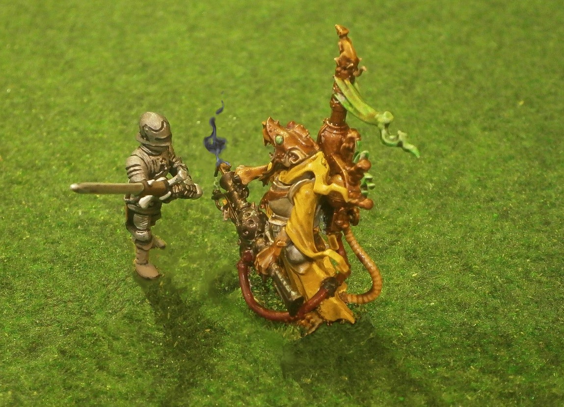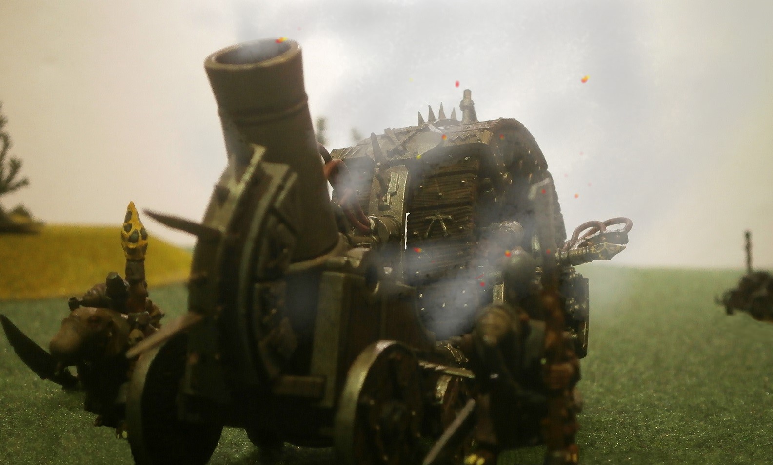This intrigued Urlak. Was the engineer just careful, always staying ahead of the bombard? Or was he impervious to its poisonous aura, perhaps due to long exposure to similar warpstone effects? If the latter, then it did not bode well for the bombard’s effectiveness, for if this fellow could develop sufficient immunity to forego the wearing of a full mask, then could the grenado really be as deadly as Clan Skryre had promised? Perhaps the engineer was employing some other trick? It was not inconceivable that the substantial tank upon his back was plumbed into his throat or lungs, or that he employed subtle magics to counteract the poison. Urlak knew he was guessing, so decided not to consider the issue further. It mattered not.