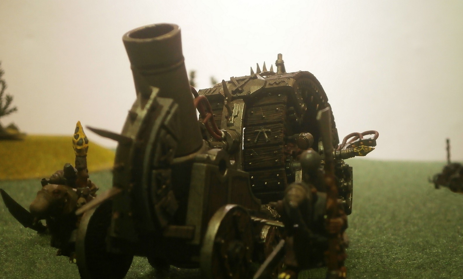As the engine rolled on between the two woods, the engineer, despite his mask, could suddenly taste the poisonous vapours leaking from the grenado even through his mask, and feel the sting of the etheric heat as it wormed its way into the material world to become sharp tendrils of real heat. The last of the attendants stumbled in pain as they tried to keep up, while two of the plague monks and two more of the jezzailers close by succumbed to the surging toxicity of the unstable orb within the bombard’s barrel.