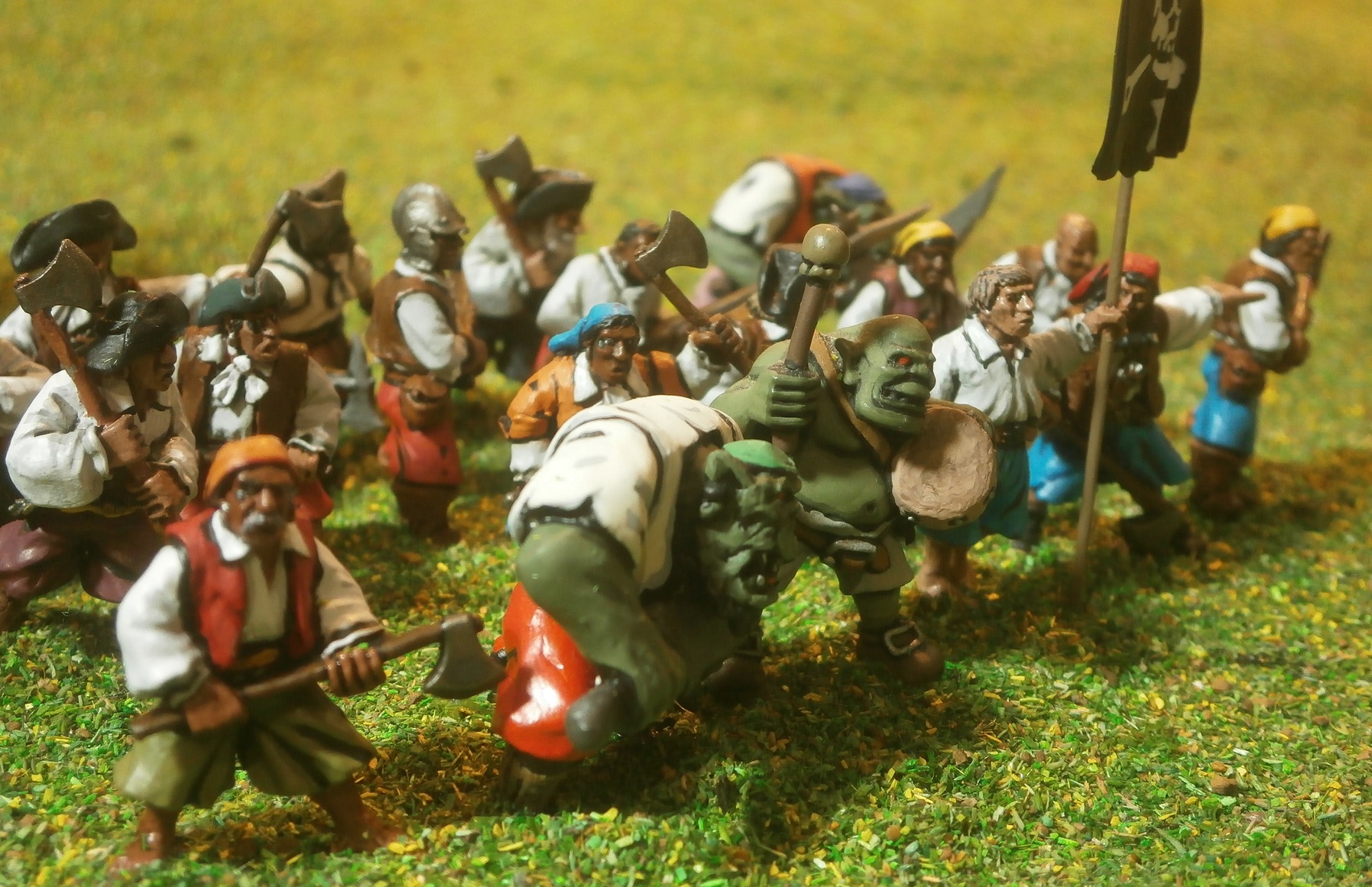 The crew were mostly armed with axes, either two-handed or boarding axes, and were famously skilled in their use, either in a fight or to expertly and quickly hack their way through bulkheads. One might wonder why they were needed when their captain could surely slice (perhaps even punch?) his way through even the toughest old oak, but he could hardly be everywhere at once could he? Besides, as he himself had declared – having adopted what he believed were the ways of a gentleman captain: such manual labour would disparage the height of an ogre in him. Why stoop to the level of a rude, mechanical seaman, when he had servants to do such work? Fighting was, of course, a suitable pursuit for a noble captain, but carpentry was not.