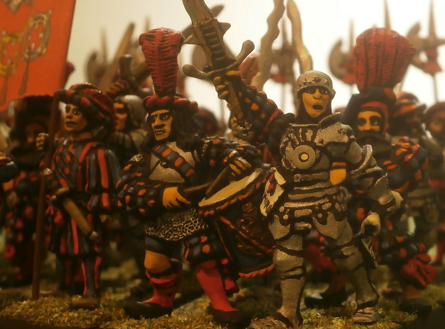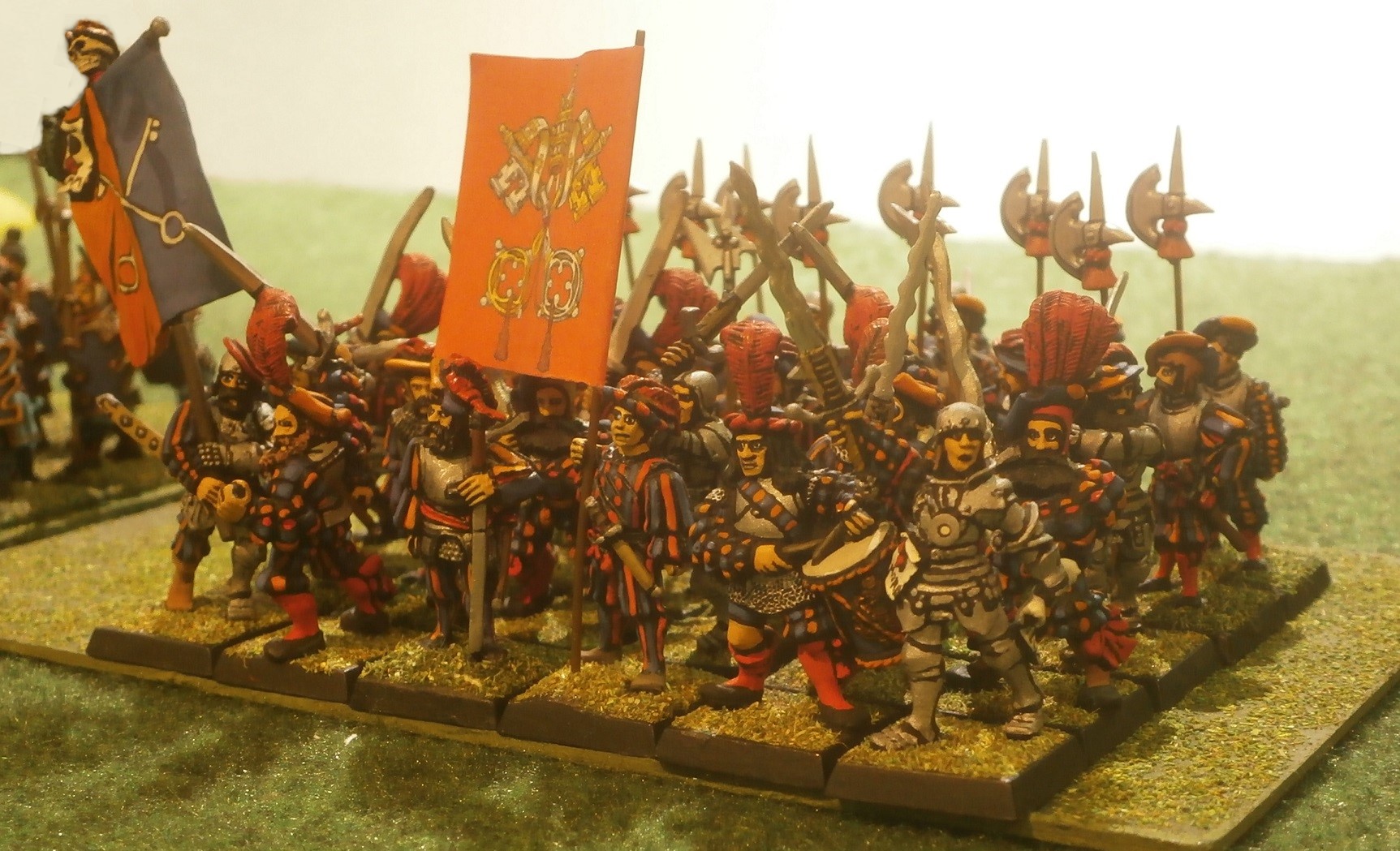 A gorgeously liveried regiment of foot-soldiers bore not only their own colours but what was likely the army standard. They bore great swords at the fore, and halberds at the rear.