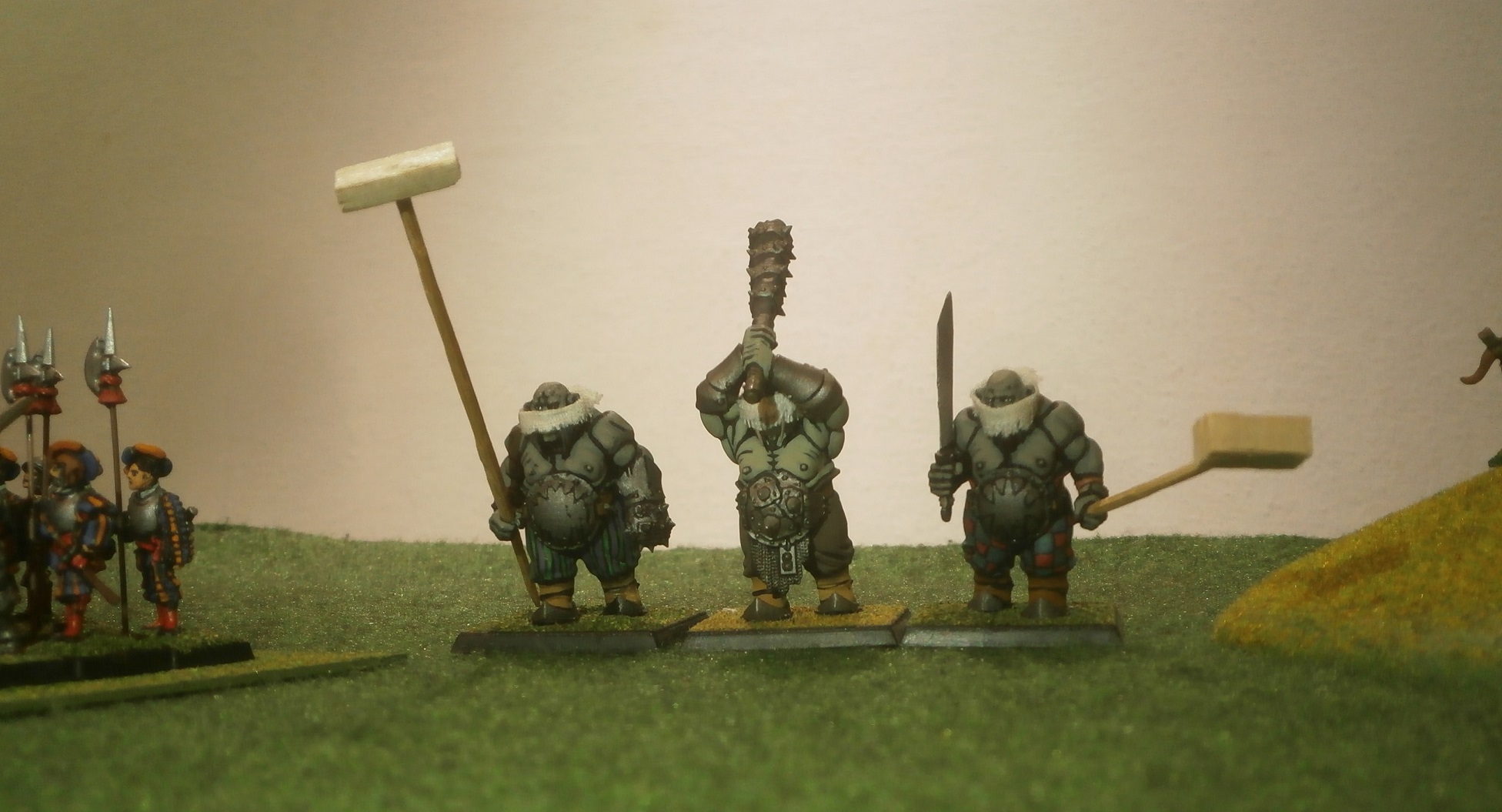 The maestro, Angelo da Leoni, had convinced his holiness Bernado that they could not risk shooting at the terror weapon, for the damage so done might cause a cataclysmic explosion which would annihilate every living thing on the field of battle (as had likely happened at Campogrotta), and so it was that the army contained some rather some unusual and irregular elements, hastily raised, including several dock-worker ogres armed with instruments for pushing the weapon over and wrecking its traction engine …