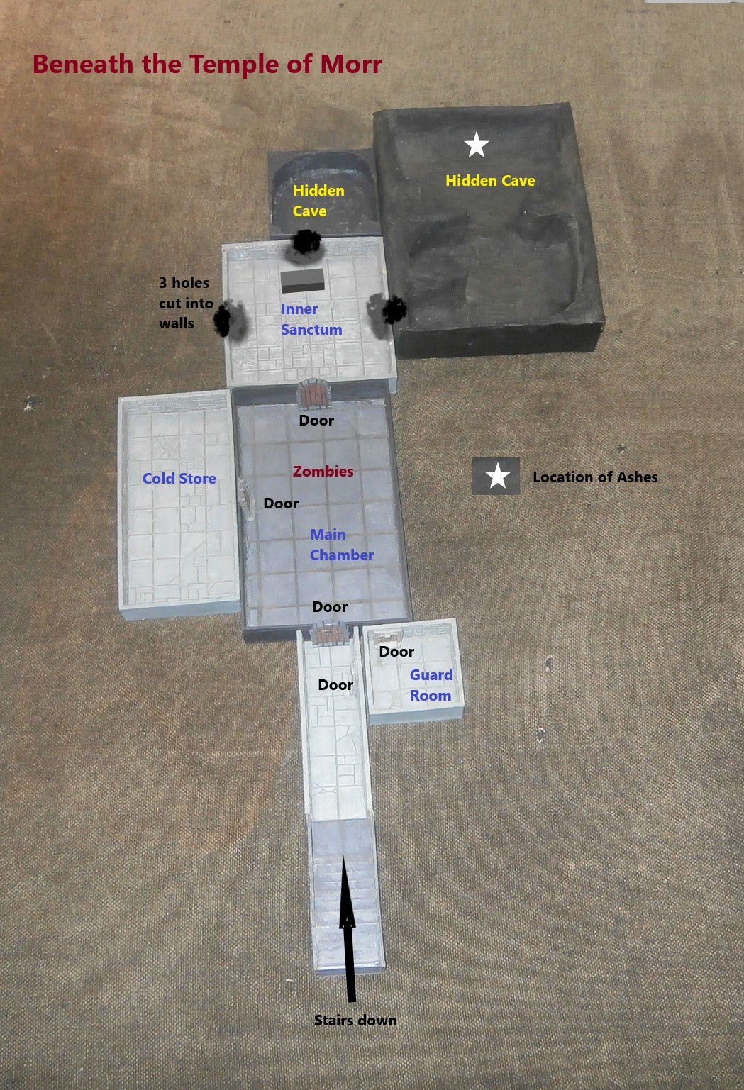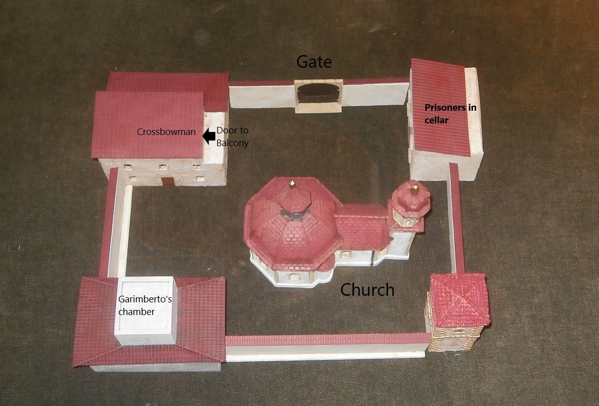 To ensure his hostages cannot escape, Garimberto had his thugs bring several of the monks’ corpses to the church, which he resurrected as zombies, commanding them into the dungeon’s antechamber to act as guards. His evil acolyte apprentice, Mastrianni, and some Rasoi thugs are with the labourers to ensure they perform their work satisfactorily. Garimberto himself is lodged in the abbot’s chamber – an upstairs room in one of the buildings, where he is studying his own books and those taken from the monastery library, to decide what to do with the ashes, and learn how to do it!