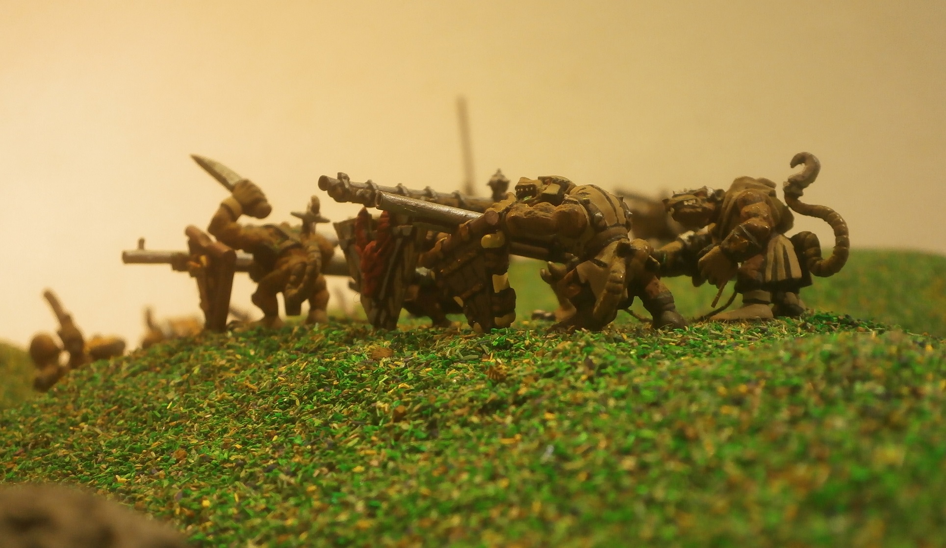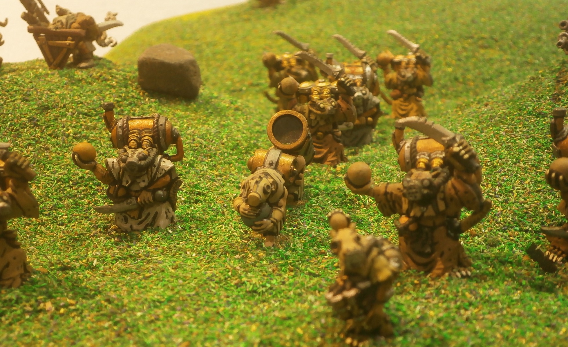 The globadiers had a weapons team with them, bearing a mortar-like weapon, strapped to the bent, and no doubt aching, back of the rear ratman, which lobbed grenadoes much further than the rest could throw them.