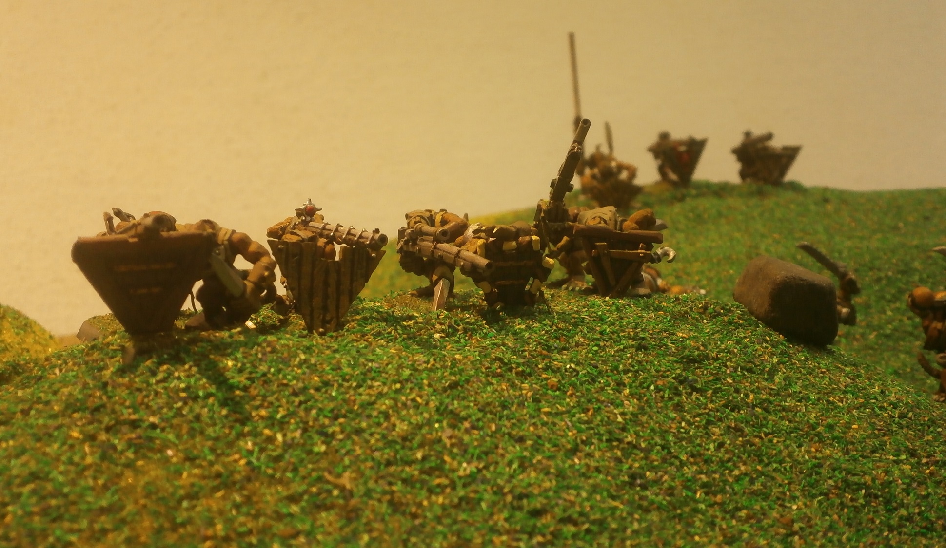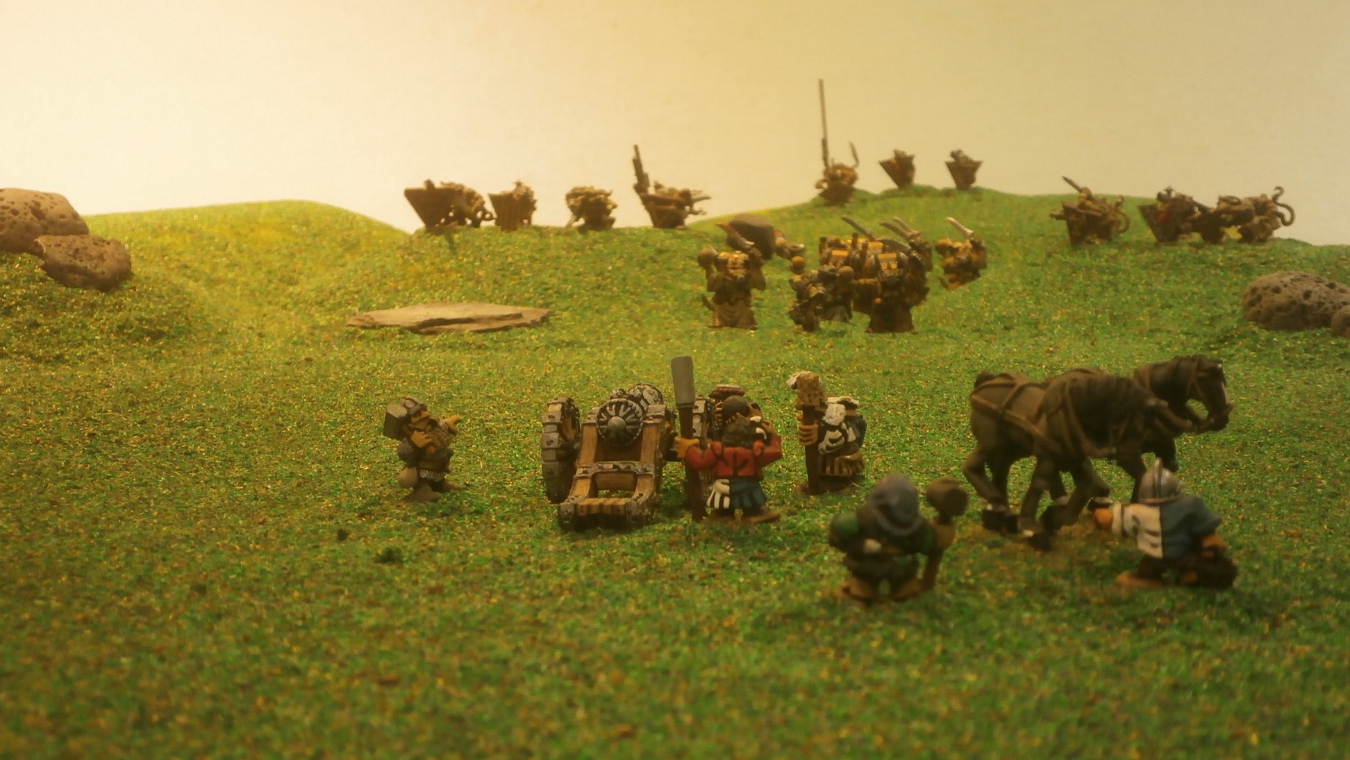 Of course, the enemy had been moving all along, and although they would have caught the dwarven gunners soon enough, they did so a little sooner as a consequence of the elves’ brief discourse. Furthermore, they had brought up the jezzails and a company of poisoned wind globadiers to the front, believed the best able to thwart any elves or dwarves with bows who intended another stand at another bottleneck.
